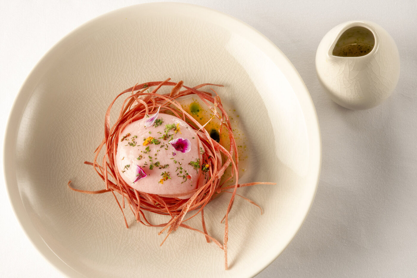 Dans l’assiette, c’est toute l’authenticité du produit qui rayonne loin du bruit du monde. Quelques plats ont ici gagné leurs lettres de noblesse : le céléri-truffe, la ravissante carotte dite « restons aimables», le surprenant entremet au citron et huile d’olive ou encore l’exquis dessert fraise-rhubarbe. Sur la partie sommellerie, les amateurs de belles cuvées viennent régulièrement déguster la centaine de références de l’appellation Grignan-les-Adhémar dont le terroir s’étend au sud de Montélimar sur les garrigues et les contreforts du Tricastin. Autour de nous, les villages perchés de Montrun-les Bains, de Poët-Laval et de Nyons, nous rappellent toute la beauté de la Dôme Provençale. On est sur un territoire qui fait de la Tanche (espèce unique d’olive, protégée du label AOP), une religion. On débutera notre séjour avec le cavage de la truffe sur le superbe Domaine de Cordis. Avec 60% de la production nationale, la région, nous dit-on, est la première productrice de truffes en France. Cette parenthèse « immersion dans le terroir » sera forte utile quand on se lancera, à l’heure du dîner, dans le tant attendu menu en huit services pensé comme un voyage en huit escales. L’«apéritif time» avec l’élégant Champagne Collet nous permet d’échanger avec les équipes en cuisine et en salle aussi avenantes que sympathiques. Les festivités prennent aussitôt belle tournure.