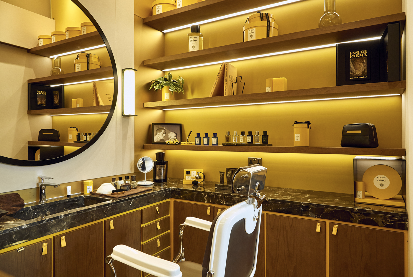 Le point non négligeable de cette boutique: un service barbier, expérience unique proposée à la clientèle qui émane des valeurs d’Acqua di Parma mais aussi de Kirei Studio. Un lieu où le goût du savoir faire et de l’élégance se rencontrent. Le projet a été développé par Nathalie Ryan, architecte d’intérieur qui a grandement contribué à l’identité visuelle de la Maison Dior pendant plus de 10 ans, en plongeant les boutiques dans les valeurs du chic à la française. À la tête de Kirei Studio, qui en japonais se traduit par beauté et élégance, elle continue de perpétuer ces valeurs …