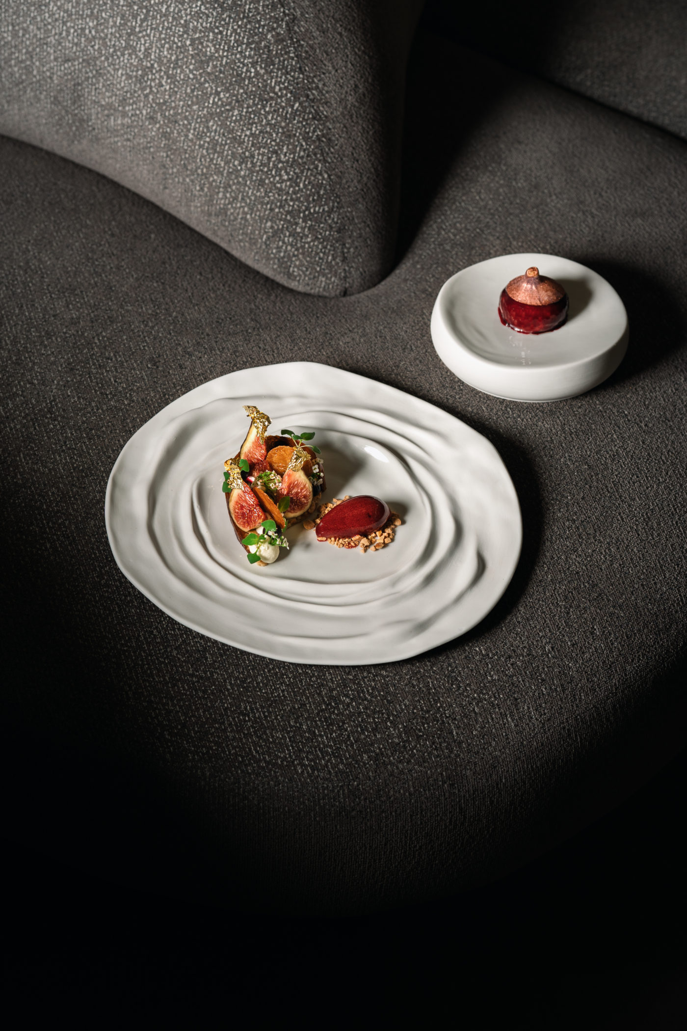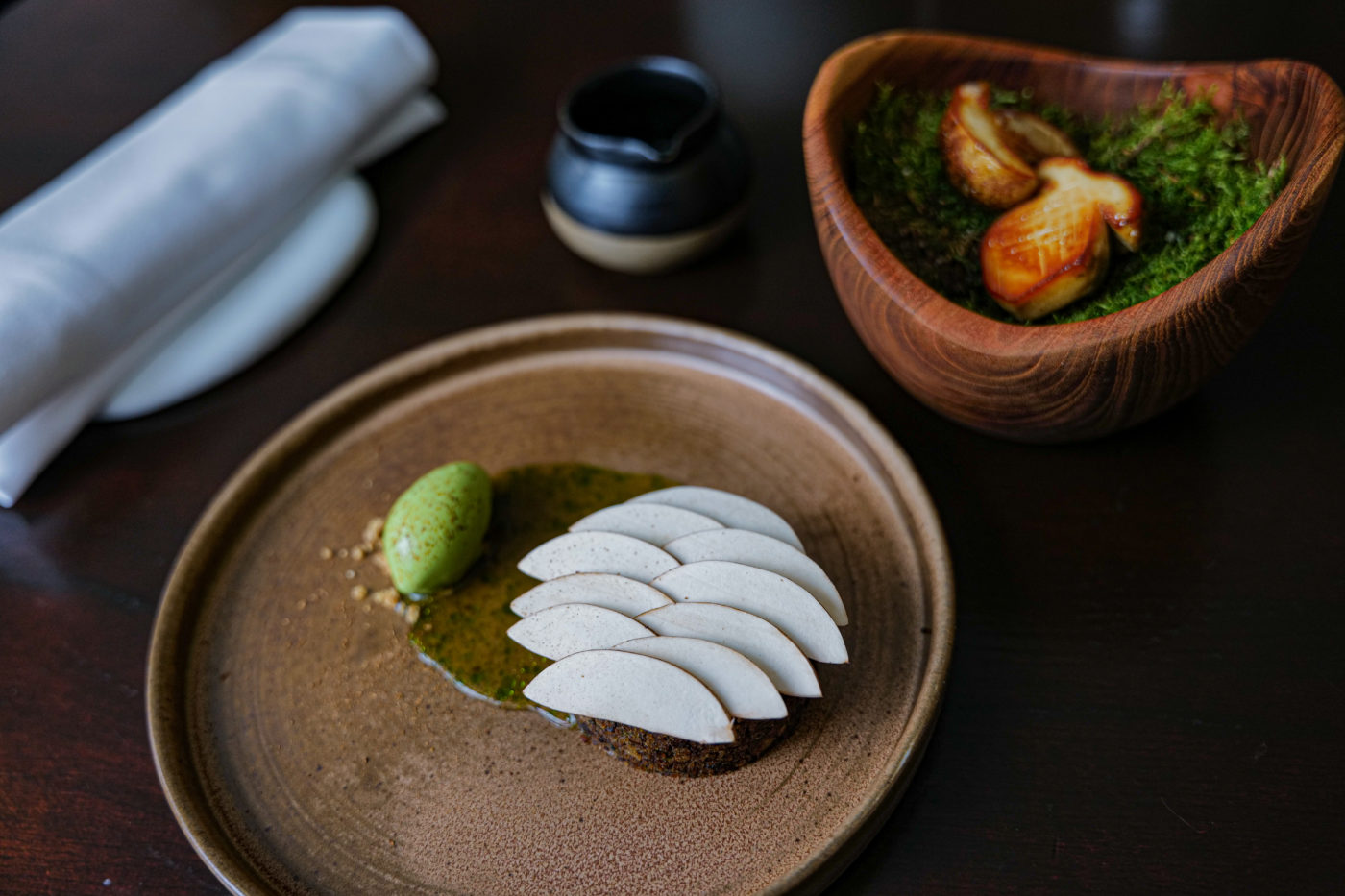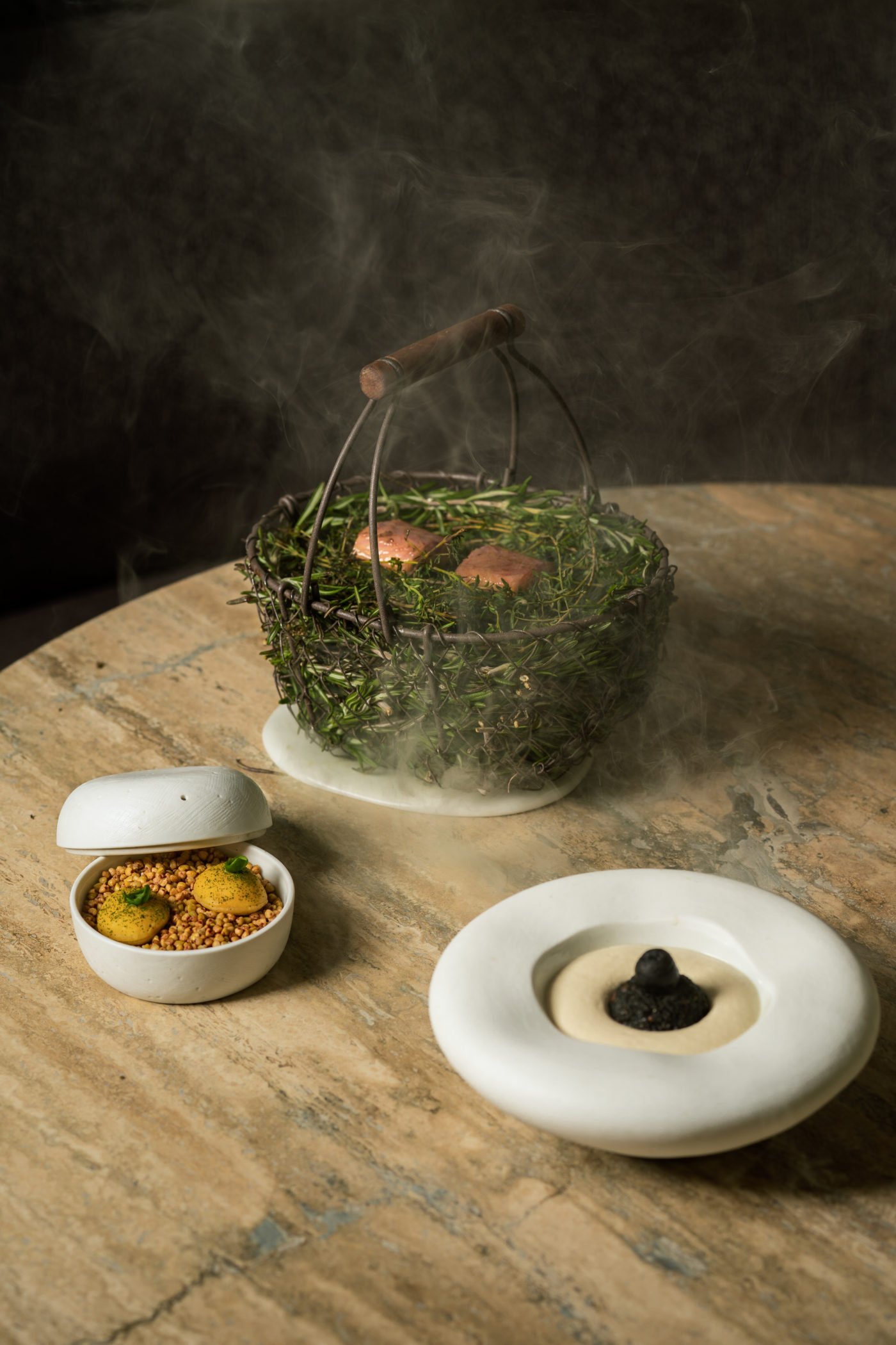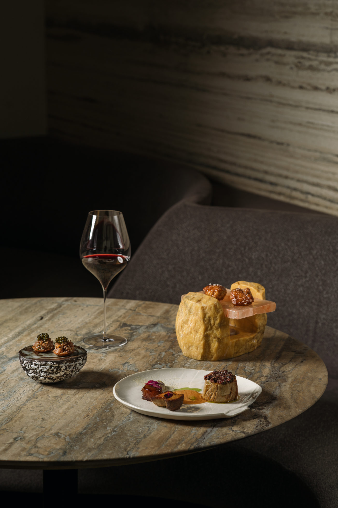 Travaillant sans relâche, dans une humilité et une curiosité insatiable, l’entrepreneur avisé poursuit sur la voie de la réussite. Réconciliant son passé et ses racines, sa table bien rythmée par les saisons livre une qualité irréprochable des produits. L’alchimiste des saveurs à l’âme altruiste qui partage sa passion pour la cuisine française est guidé par l’étoile du destin. On décide de partir sur une découverte en menu cinq séquences pour découvrir cette cuisine traditionnelle et exotique portée par une soif de transmettre et un parcours exemplaire. Première émotion en bouche, la tuile de Man’ouché au thym et sésame définit le cadre. Ensuite, le foie gras cacahuète fait mouche en ouvrant un ballet d’arômes exceptionnel sous la partition suivante : huitre végétale, œuf de truite et raisin de mer, tartare mayonnaise à l’anis vert, kadaïf, houmous, crumble de pignon de pin et citron caviar.