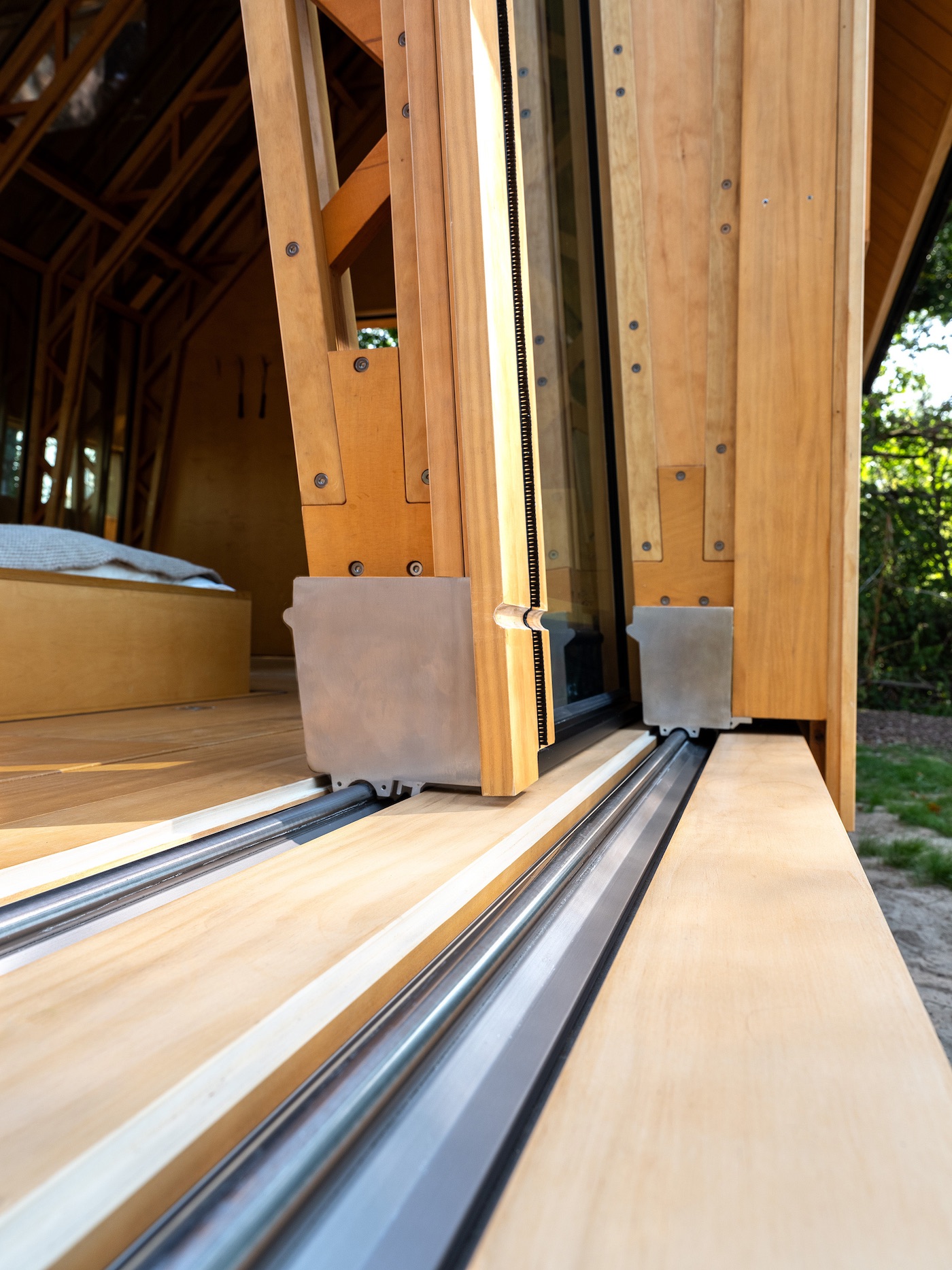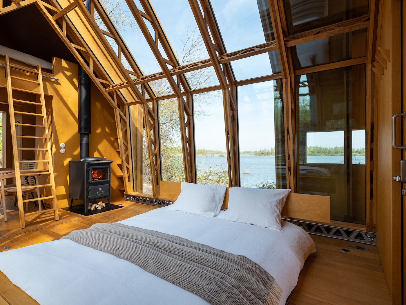 S’il fait trop chaud, les invités peuvent soit faire glisser et fermer la couche de bois pour garder la fraîcheur à l’intérieur, soit ouvrir la couche de verre pour permettre à une brise fraîche d’entrer. En toutes saisons, vivre et dormir sous le verre, ou à l’extérieur avec des couches protectrices, se fait en toute facilité.