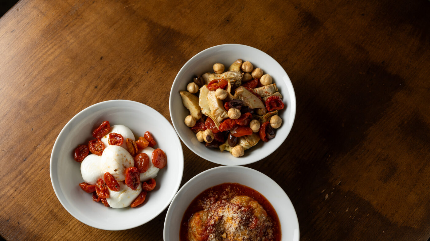 Chaque plat, préparé dans les règles de l’art, fait honneur aux savoir-faire traditionnels de la Botte. Mais qu’est ce qui rapproche ce « projet » des autres best hot spot pasta de Paris (Tempilenti, Passerini, Anna, Scarpetta, Il Bacaro, Osteria Ferrara…) ? Certainement cette volonté de se battre pour échapper aux clichés avec des « vraies » assiettes délivrant un plaisir réel. On mise sur une fabrication artisanale de pâtes sur place (l’imposante machine dans le fond de la salle n’est pas juste un élément de décor) avec des ingrédients importés directement d’Italie. Chaque jour, est mis à l’honneur une région d’Italie en faisant chanter la beauté des noms de ces plats-poèmes : Puttanesca, Salsiccia, Carciofi, Ruggine… Une ode à l’art de vivre transalpin dans ce qu’il a de plus joyeux. A notre arrivée, au 16, rue Saint-Augustin, dans le 2ème arrondissement, nous sommes accueillis par la responsable de salle Suzanne Hug (passée par les cuisines de l’Elysée, Cheval Blanc et le Fouquet’s) dans la bonne humeur, celle qu’inspire d’un mois d’août ensoleillé paisible et réjouissant. Aucun signe « hipster » au prime abord. Le décor fait légèrement pensé un bar clandestin avec ces affiches rétro éparses sur les murs laissés à l’état brut. On attaque les festivités avec les antipasti. Au programme ? Une généreuse Mozzarella Di Bufala de la Maison Nanina à Paris et tomates séchées siciliennes, de ravissants Carciofini (artichauts des Pouilles et noisettes du Piémont) ainsi que les divines Polpettes, des boulettes de viande avec sauce Sugo et Parmigiano Reggiano.