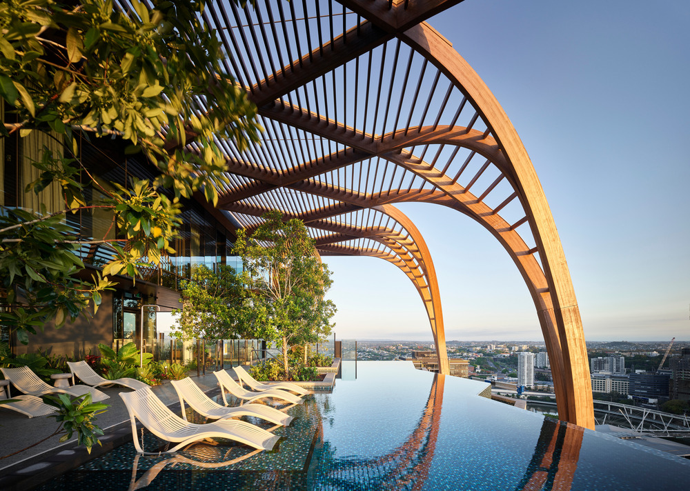 L’architecture d’Upper House est conçue pour célébrer la beauté naturelle de Brisbane, son style de vie urbain détendu et son climat subtropical doux. Ponctuant l’horizon de la ville avec une pergola en bois et une oasis tropicale sur le toit, Upper House propose aux résidents pas moins e 1 000 m² d’équipements de bien-être.