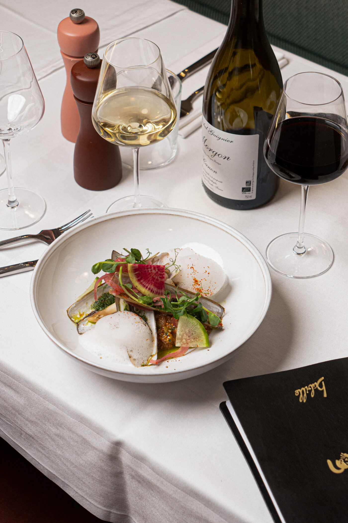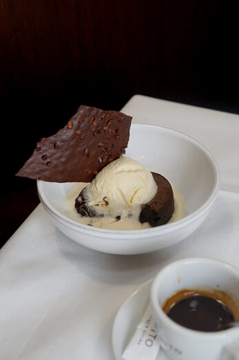 Sur cette partition en trois temps, l’étape du plat de résistance représente un instant crucial où il faut garder le cap. Quelques épicuriens avisés, rencontrés la veille, n’ont pas tari d’éloges sur le magnifique suprême de volaille, purée de topinambours et champignons (28 euros). Ils nous ont également vanté la bonté du généreux filet de daurade à la plancha, fenouil confit, carottes roties, olives kalamata et sauces aux agrumes (32 euros). Notre coeur balance. Toutefois, quelque chose nous dit que la vérité se trouve ailleurs. D’après nous, la ravissante poitrine de cochon confite (24 euros) donnera le la. Accompagné d’une purée de céleri rave au miso et broccolini à la plancha (24 euros), ce plat-signature assouvit notre curiosité et apaise notre palpitant. Pour la soif ? Le sympathique Petit Cablis du Domaine Vrignaud sur le millésime 2023. Ce 100 % Chardonnay est à la fois frais et fruité. Il se caractérise par des notes d’agrumes au nez et une bouche plein de rondeur.
