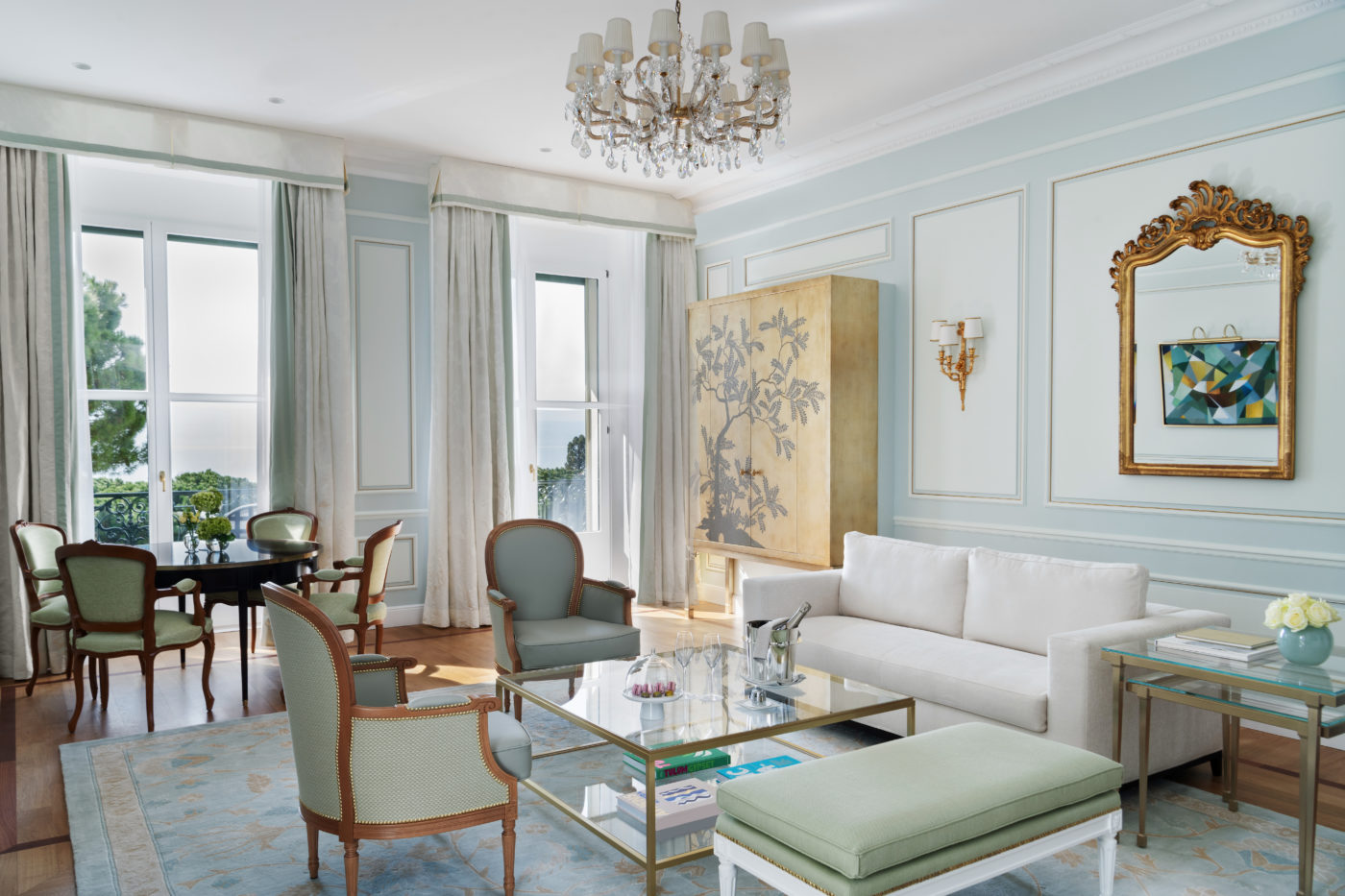Indissociable de l’hôtel, le lac, dans sa chromie et ses nuances, entre littéralement dans les 63 chambres et plus précisément dans les neuf suites iconiques de ses deux ailes (Suite Riviera, Suite Art Déco, Suite Malmaison, Suite Royale, Suite Impériale, Suite Paradiso, Suite Panoramic, Suite Duplex, Suite Spa) dans des personnalisations poussées à l’extrême. L’architecte Pierre-Yves Rochon en maître d’orchestre éclairé et qui avait déjà signé la rénovation de l’aile Palace en 2014, a convoqué les meilleurs artisans locaux qui ont travaillé avec des matériaux respectueux de l’environnement. Le travail, en tout point parfait des courtepointières, accompagne le parti pris de proposer une forme d’épure lumineuse dans un juste équilibre entre des pièces de mobilier nouvellement créées et des pièces-trésors d’époque venues du garde meuble et des archives papier du palace. Lors de notre déambulation, on est sidéré par le caractère ultra modulable de la Suite Art Déco pouvant se développer avec d’autres suites pour offrir 10 couchages et devenir ainsi la plus grande suite de l’hôtel, permettant d’accueillir des familles complètes et des délégations dans un confort optimum. Tout aussi impressionnantes, la Suite Impériale avec ses 115m2 de terrasse et la Suite Panoramique offrant un rooftop à couper le souffle face à la beauté tellurique des montagnes, cultivent la sérénité absolue dans de somptueux pieds-à-terre de légende. L’excellence et l’exigence de cette rénovation trouvent également leur splendeur et leur démesure dans ces quelques chiffres qui donnent le vertige : 200 tissus différents, 25000 m2 de peinture, 3400 m2 de marbre, 2630 m2 de corniches, 2500 objets, 2060 m2 de parquet, 30000 m2 de plâtrerie, 15 kilomètres de moulures en bois… Chaque chambre et suite fait l’objet d’un équipement en domotique et connectique de pointe : celui-ci assure la gestion de l’intensité de la température et de l’intensité lumineuse en fonction de l’occupation, de la période de la journée et des saisons.