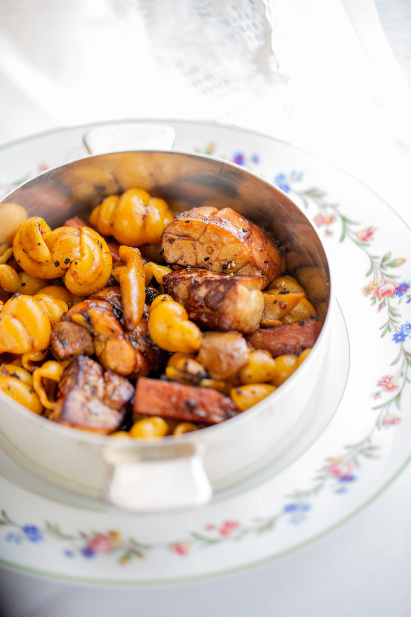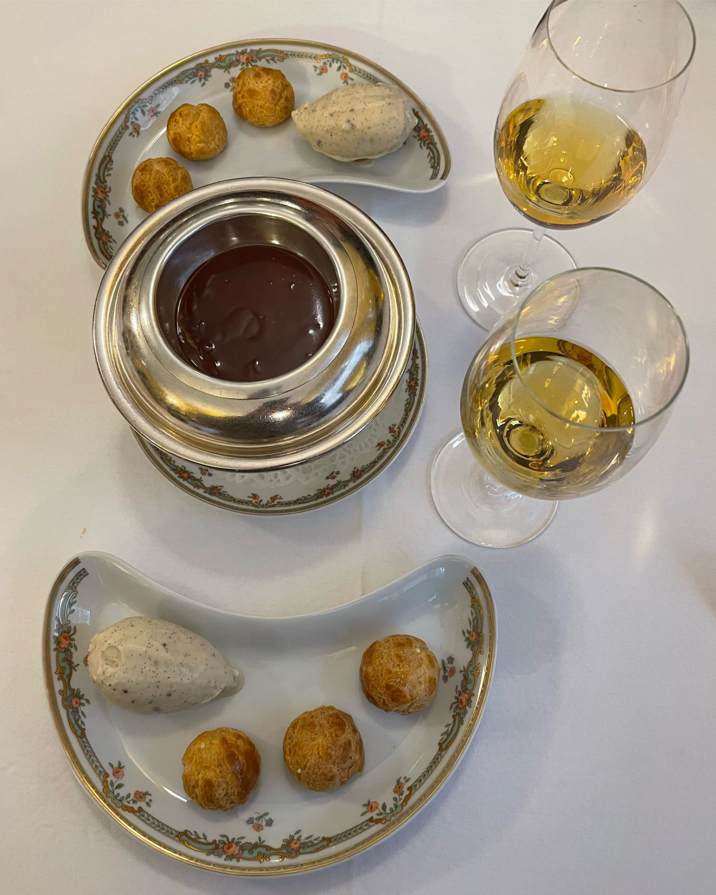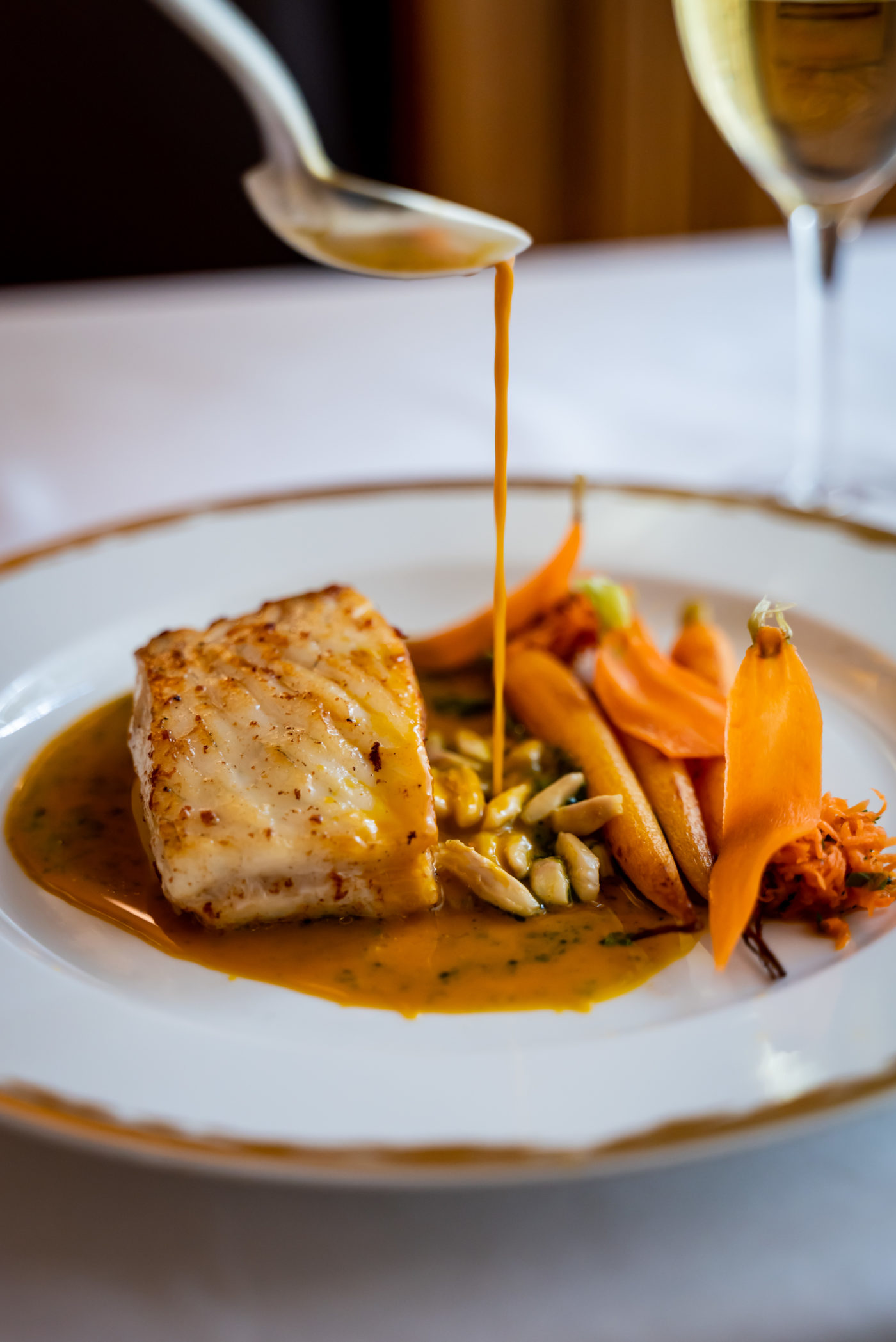 La tradition est ravivée. Le sommelier Louis Liberti imagine cet accord mets et vins avec un Meursault floral du Domaine Michel Lafarge. Arrive ensuite l’immanquable turbot doré, carottes fondantes et sucs de cuisson. Un silence s’installe tant l’assaisonnement y est parfait dans une juste quantité de condiment. On retient son souffle à l’arrivée, sous belle cassolette, du divin Sauté gourmand de ris de veau, crêtes et rognons de coq, fois gras et jus truffé. L’absolue saveur dans la réjouissance est sidérante. L’élégance et la puissance contenue du Côte de Nuits-Villages 2019 de la maison René Bouvier à Gevrey-Chambertin, qui accompagne le maître-plat, s’impose comme une pure évidence.