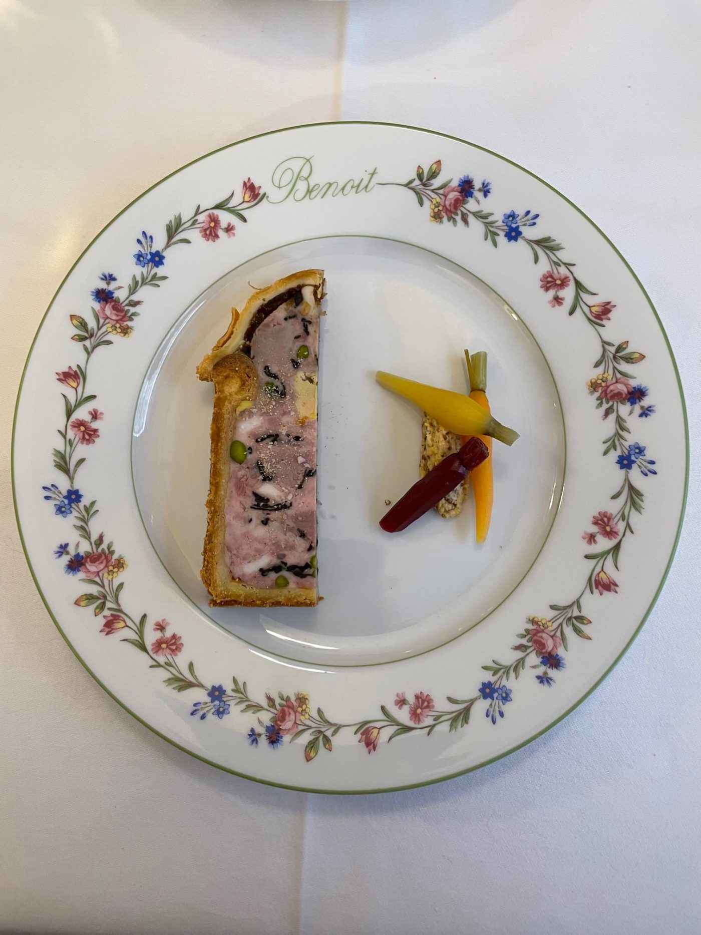 Succédant depuis janvier 2022, à Fabienne Eymard, la brillante cheffe trentenaire haut-savoyard Kelly Jolivet ( passée notamment par le Louis XV à Monaco et ex cheffe de Ducasse sur Seine) permet à Benoit de poursuivre sa trajectoire parmi les Grands Bistrots de Paris. On se lance alors dans la dégustation, vaillant, après un délicieux accueil d’Emma Riomet, à la direction de la salle, qui ouvre le bal des festivités avec un subtil Pol Roger 2015. Les assiettes siglées d’un « B », annoncent par ce cachet de la maison, de beaux auspices. Entrant par les fondamentaux dans la dégustation, on fait l’expérience du légendaire pâté en croûte pickles de légumes d’une angélique innocence dans ce fin répertoire culinaire.