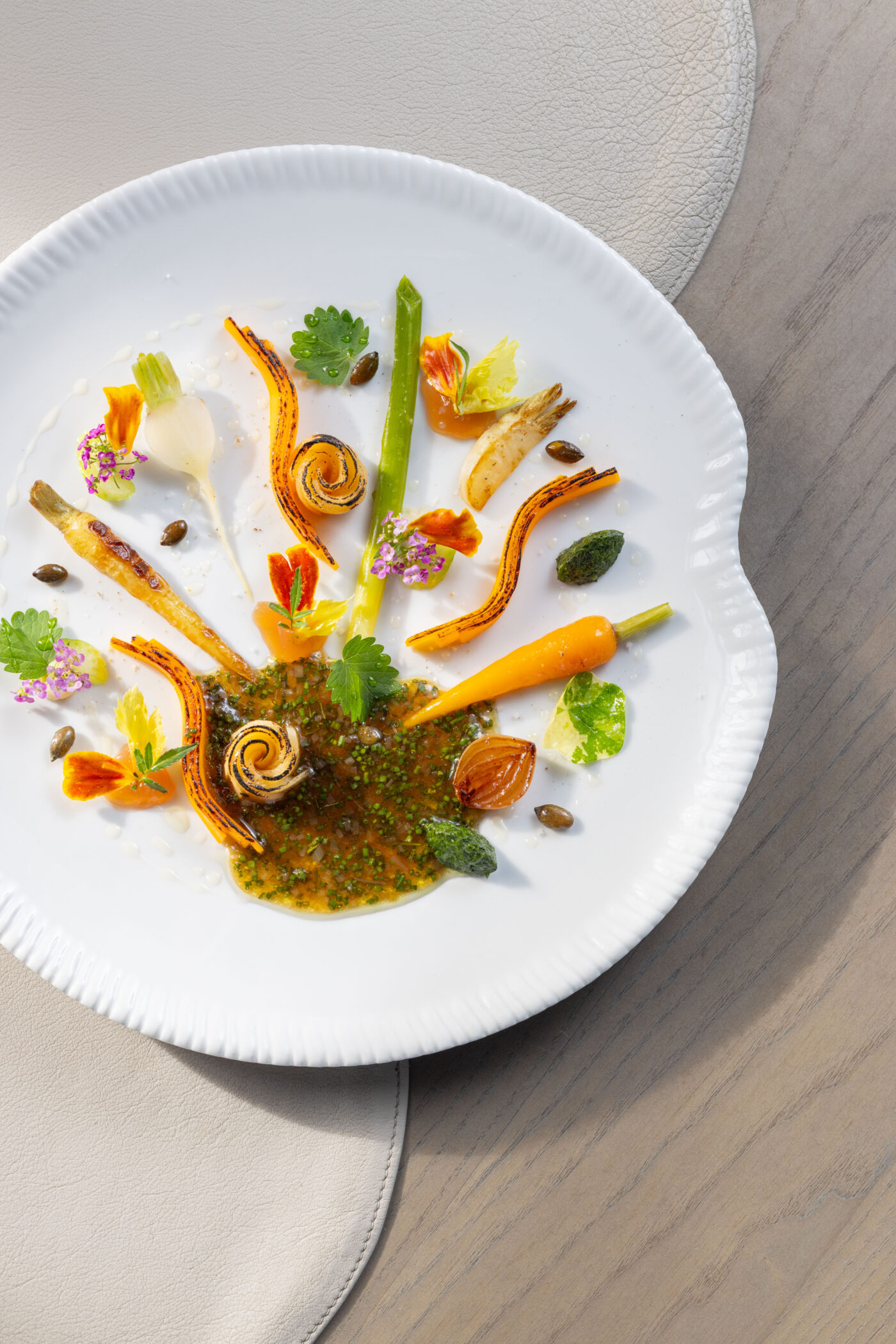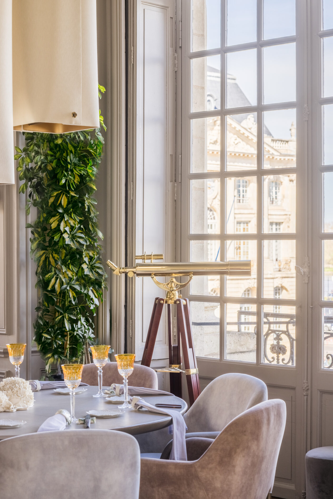 Place de la Bourse, Le Gabriel, tel un nid d’aigle, offre l’une des plus belles vues plongeantes sur la Fontaine des Trois Grâces. Au coeur de cette noble bâtisse, acquise en 2019 par la famille de Boüard de Laforest (propriétaire de Château Angelus à Saint-Emilion), le temps s’arrête face à la Garonne et l’impassible miroir d’eau. C’est au 2ème étage que tout se joue et que quelques privilégiés découvrent la fascinante partition culinaire de Bertrand Noeureuil à la table étoilée de l’Observatoire du Gabriel. Certains viennent de loin pour goûter à son interprétation fantasmée de l’Aquitaine. Cet homme bibliophile et collectionneur d’ouvrages rares de cuisine (Dans sa bibliothèque personnelle, figurent une édition d’Escoffier datée de 1907 et « la Cuisine Cousue-Main » parue en 1972 aux éditions Christian Dior), a d’abord fait ses armes auprès de Daniel Gonzalez et David Biasibetti au restaurant ô Saveurs à Rouffiac-Tolosan avant d’acquérir les fondamentaux de la technique aux cotés de Yannick Alléno au 1947 à Cheval Blanc Courchevel. Viendra ensuite la Vague d’Or à Cheval Blanc Saint-Tropez, une étape importante avant d’intégrer Plénitude en qualité de chef adjoint. C’est là que nait la filiation avec son mentor Arnaud Donckele. Durant l’ouverture du restaurant, le jeune chef pré trentenaire d’origine toulousaine développe son amour des arts de la table, travaille sur l’identité et la construction d’un menu. Il affûte sa connaissance saucière et apprend la « vision » d’un restaurant jusqu’à l’arrivée, au bout de six mois, des trois étoiles. La consécration.