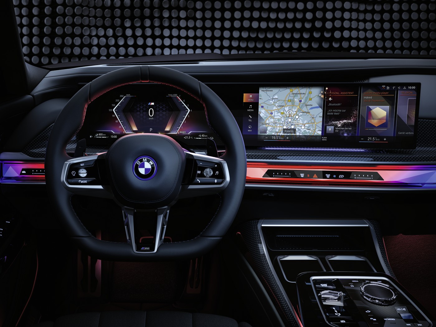 Pour l’intérieur, cette série 7 dispose d’une nouvelle sellerie « Veganza », un matériau reproduisant les propriétés du cuir, disponible de série en quatre coloris. Disponibles en option : intérieur BMW Individual en cuir Merino et intérieur M Sport pour les modèles BMW M et les modèles dotés de la finition M Sport, proposés tous deux en cinq coloris. Également disponible : intérieur BMW Individual avec éléments exclusifs en cuir Merino bicolore ou en cuir Merino/laine cachemire, proposé pour la première fois.