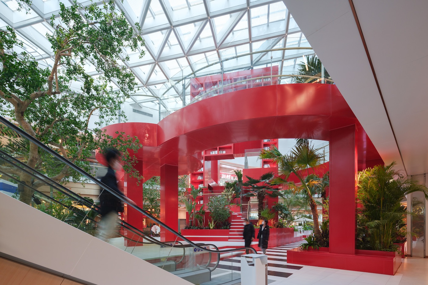 Dans l’espace central de l’atrium, l’entreprise a choisi comme point central une structure de cube rouge à deux étages, entourée d’une jungle de plantes et d’eau. Rappelant les scènes primitives et mystérieuses des peintures de Rousseau, les couleurs vibrantes, la lumière et l’ombre invoquent une atmosphère imaginative et onirique.