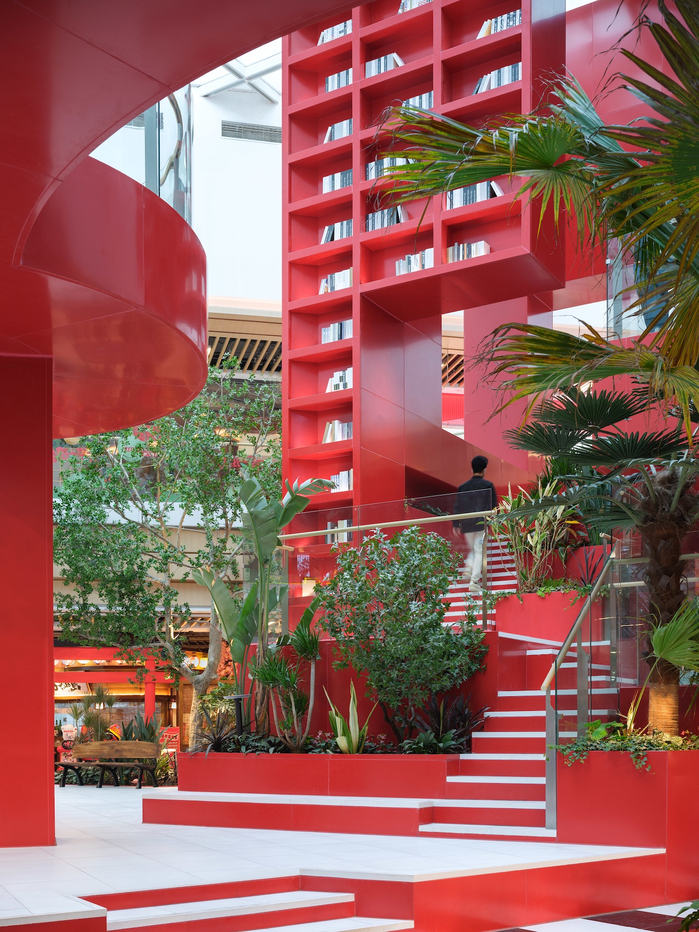Un pont circulaire au premier étage relie le cube central à ses environs avec des escaliers variables. La verdure tropicale, les sièges, les plans d’eau et les escaliers créent des détails à l’échelle humaine, améliorant l’expérience de marche et incitant les clients à s’attarder et à explorer. Ce sentiment de plein air séduisant offre à ses visiteurs un lieu où leur imagination peut vagabonder librement.