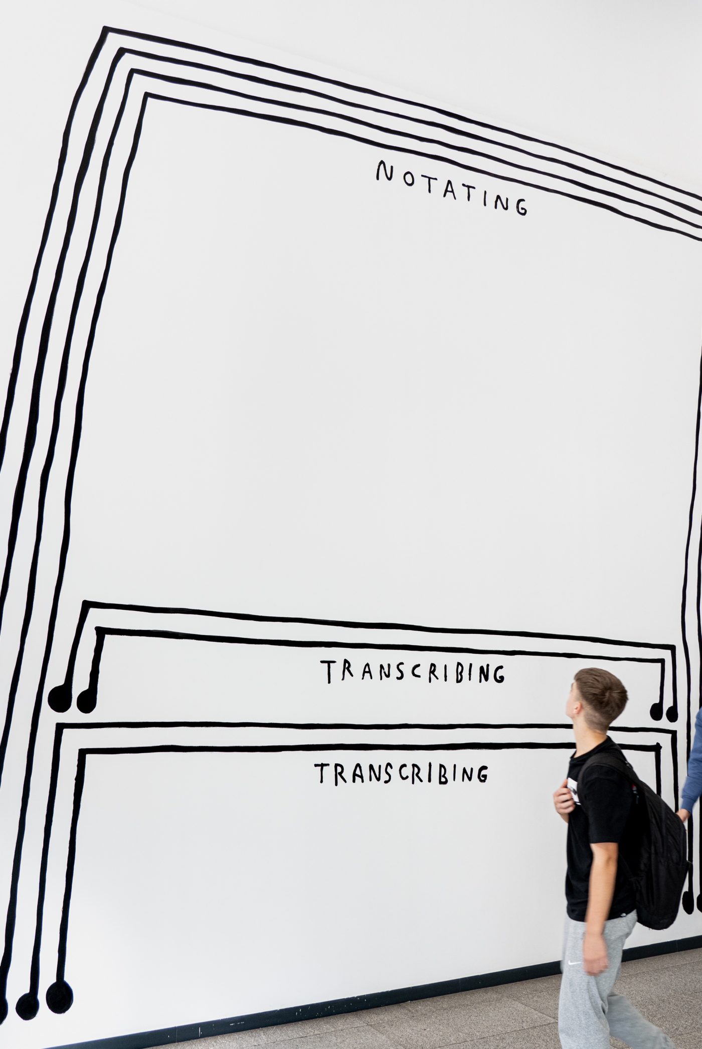 On y découvre « Notating Transcribing Transcribing » qui est une grande œuvre murale représentant l’espace dans lequel deux langues se croisent. A coté de cela, la vidéo « The Star-Spangled Banner »  montre l’artiste interprétant l’hymne national américain en langue des signes lors du principal événement sportif du pays : le Super Bowl. Tandis que l’animation digitale « A String of Echo Traps » explore, elle, la notion d’écho en tant que phénomène littéral et métaphorique. L’artiste a recours à différents concepts pour mettre en lumière le cœur de sa pratique artistique : la notation musicale, le langage écrit, l’infographie, le langage des signes, le corps et l’humour pour défier la politique du son et des langues. Représentée par la galerie François Ghebaly (Los Angeles) et White Space Beijing (Pékin), Christine Sun Kim est accompagnée par des institutions telles que le Queens Museum de New York (2022), le Drawing Center de New York (2022), le Museum für Moderne Kunst de Francfort (2021), le Manchester International Festival (2021), le MIT List Visual Arts Center à Cambridge, Massachusetts (2020) et la Whitney Biennial à New York (2019). Sa gestuelle artistique repose sur une relation forte entre le son et la langue des signes dans un jeu de transmission via des signes graphiques aux valeurs universelles. Son art a vocation a créer des ponts et des connexions entre le monde des entendants et celui des malentendants.