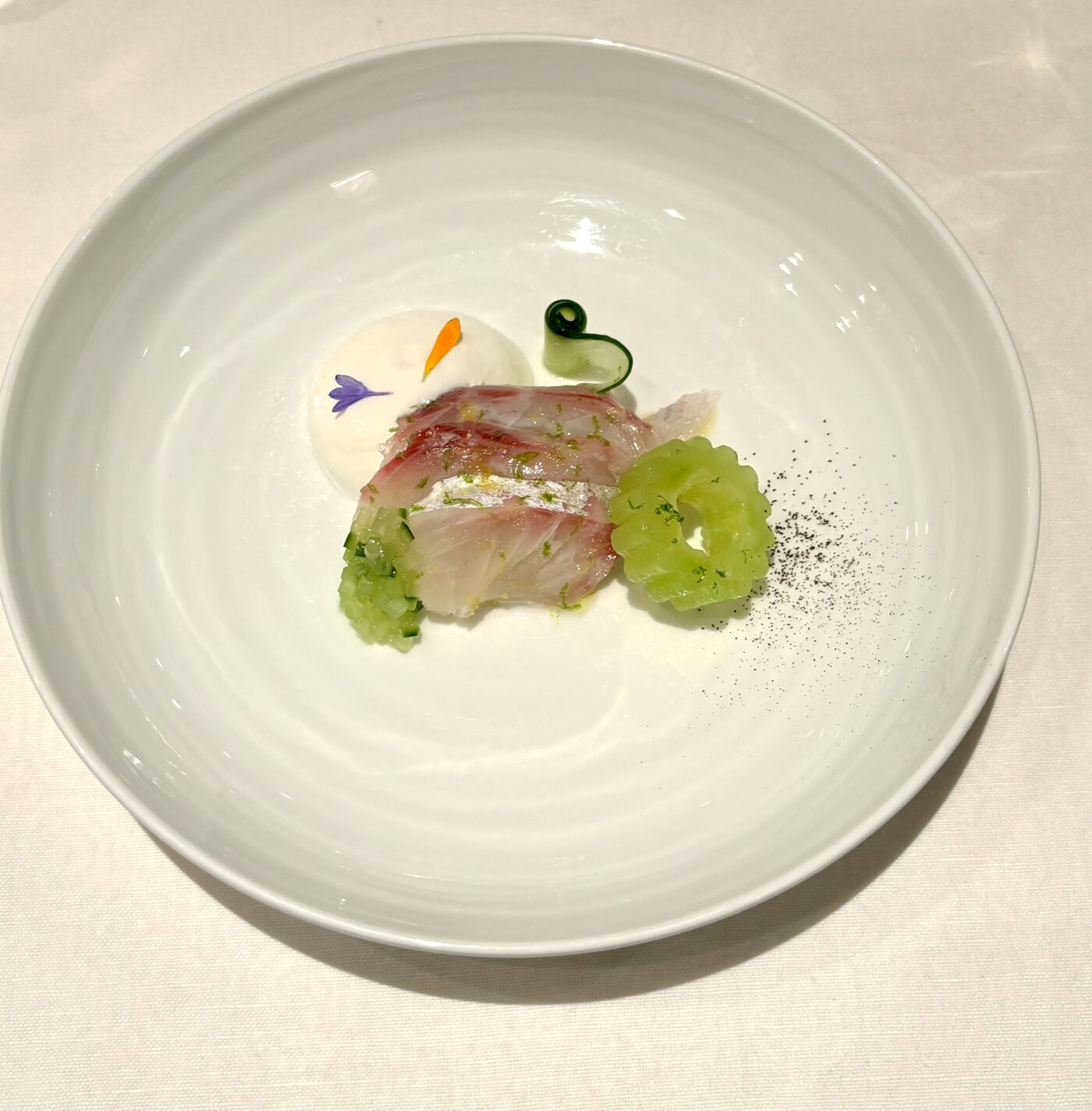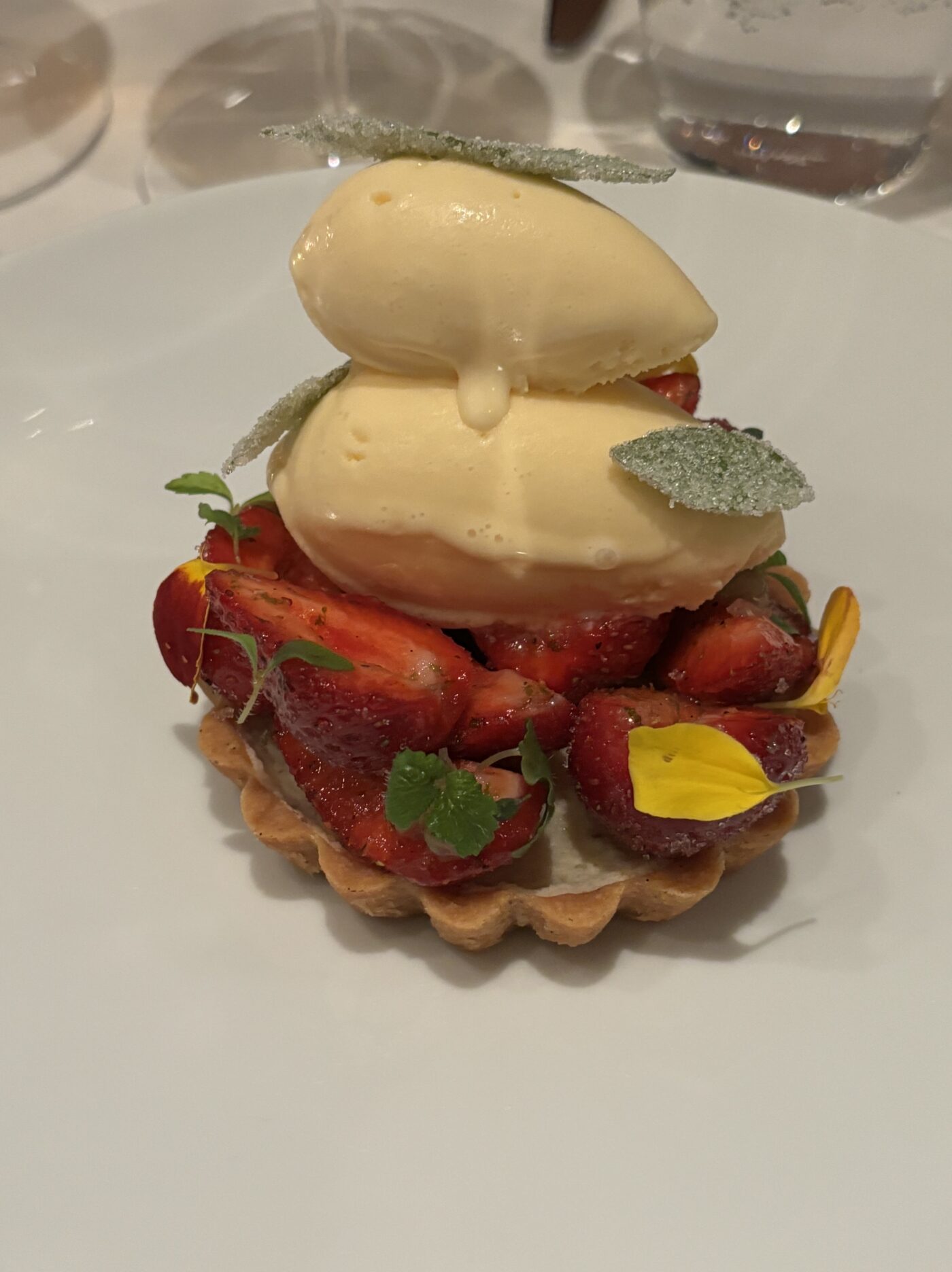 Les bulles d’un Hervé Rafflin extra-brut 1er Cru La Nature’l nous mettent dans de très bonnes conditions. Le gaspacho de tomates anciennes et lavash au romarin trouve un remarquable accord avec la pépite du Saumur Brézé 2021, David d’Arnaud Lambert. La patronne ouvre judicieusement le bal avec audace et générosité. Le carpaccio de bar concombre, yaourt, citron noir est simplement orgasmique au palais dans une précision sans faille. Ce constat se confirme avec la venue attendue de la fameuse aubergine en persillade sauce Romesco. Dans le verre, ce sera alors le bouleversant Château de Lucey, Chapitre 19, roussette de Savoie 2019. Un instant de divine douceur qui annonce le magistral plat signature du risotto carnaroli, homard bleu poché au beurre blanc. Un véritable tableau porté dans son envol par l’association des poireaux, de l’estragon et de cette sympathique sauce rendant hommage au beurre blanc.