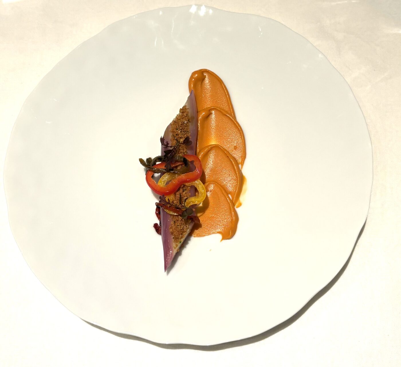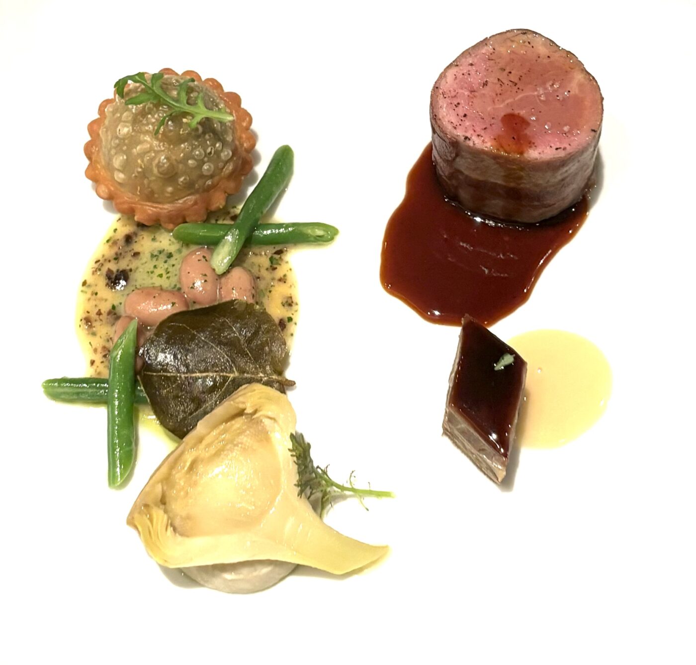 On en redemande bien sûr. Le chef Noam Gedalof, ayant sévi en Californie (à The French Laundry dans la Napa Valley), au Kaizen à Montréal et à Paris au Sergent Recruteur nous enchante avec sa créative partition aux notes très personnelles. La sommelière se surpassse, elle aussi,  en nous invitant à aller vers quelques merveilles alsaciennes à travers la découverte de l’exceptionnel Marcel Deiss Engelgarten 2019. Au cœur de cette valse gustative, on annonce l’incontournable filet de veau corse biologique du grand  Jacques Abbatucci avec pressé et jus. Dans l’assiette, le dressage attrape le regard entre artichaut poivrade, haricots borlotti, barbajuan d’été et vinaigrette aux câpres.