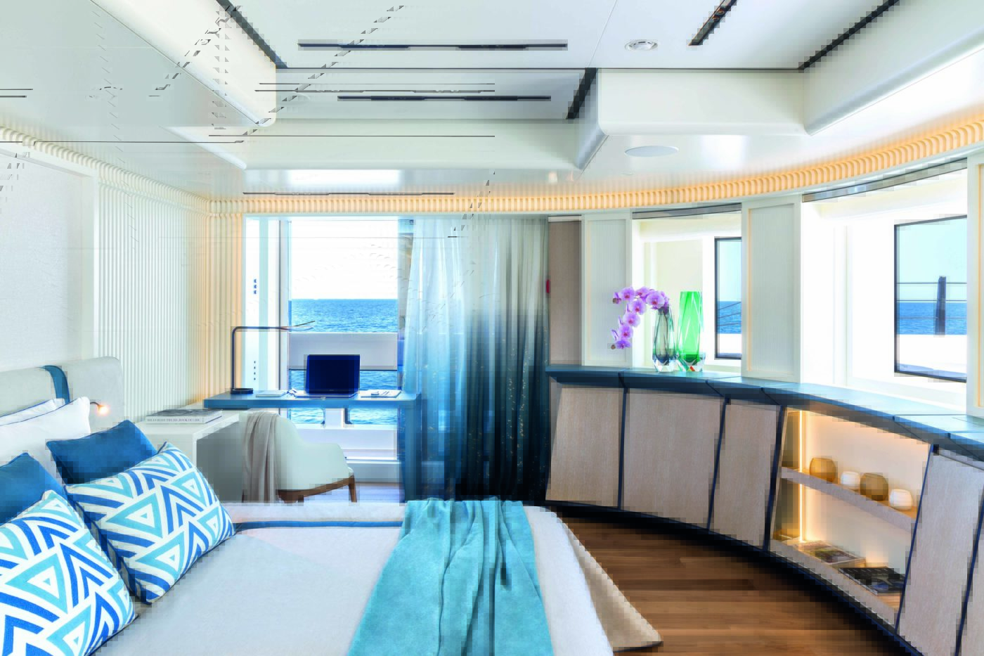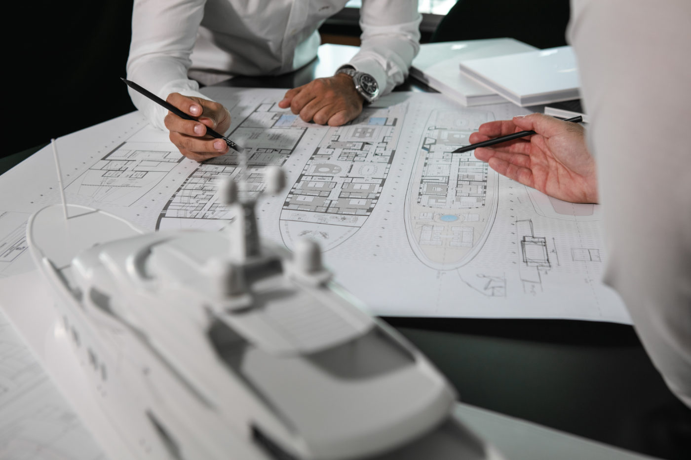 On passe du rêve au design. Le voyage commence par une feuille de papier vierge, la toute première étape pour capturer la vision et les attentes du client. Ce processus évolutif d’écoute attentive et de discussion approfondie implique l’équipe de projet interne et un groupe restreint d’architectes et de designers de renommée mondiale avec lesquels CRN collabore depuis de nombreuses années, ainsi que bien sûr le propriétaire et son personnel. On est sidéré par la coordination et cette mécanique de précision s’établissant entre les différents départements du groupe. Gianluca Ciniero, en qualité d’Engineering Manager nous renseigne ainsi : « Nos préoccupations majeures portent sur le confort et la durabilité, la réduction du bruit et des vibrations à bord mais aussi l’efficience via un système d’analyses internes propre à CNR. Nous avons environ 10 projets se situant entre 28 et 50 mois. La question des certifications notamment liées aux spas nous importe beaucoup, tout comme les sujets de l’énergie liée au green méthanol à bord par exemple ». L’exploration continue en se concentrant sur la façon dont le client souhaite « vivre » son bateau de plaisance et profiter de son temps à bord. Cela façonne et définit un concept et diverses propositions, aboutissant à un premier plan d’aménagement général. C’est le tremplin vers l’étape suivante dans laquelle est peaufiné le projet toujours plus en détail, petit à petit, au fur et à mesure qu’il prend vie. Et cela peut durer de quelques mois à plus d’un an. Cette progression extrêmement rigoureuse et cette quête continue pour réaliser au plus juste tous les désirs du propriétaire ne souffre aucun compromis. Chaque navire devient une opportunité pour le propriétaire d’imaginer des solutions de conception de pointe et une foule d’innovations fonctionnelles et esthétiques jusque dans les moindres détails. Les équipes avancent avec cette obsession constante de voir les éléments du bateau entrer en parfaite harmonie : l’aménagement, la coque, la proue et la poupe, le tirant d’eau, les performances, les caractéristiques de chaque pont, les volumes de chaque espace, la conception du club de plage, du cinéma, de l’espace bien-être et de la salle de sport.