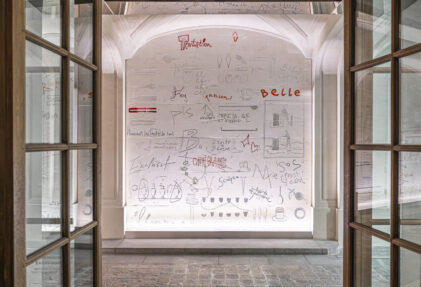 Dans ce ce lieu double devenu depuis son ouverture, il y a un an, la « place to be » parisienne faisant la part belle autant à l’art, la gastronomie, la mixologie que l’artisanat, les frontières du temps s’effacent et l’émotion dicte à chaque instant ses lois. Au sein de cet écrin marqué par les hiéroglyphes modernes de l’artiste Harry Nuriev, les pièces en bois sculptés de Jean-Guillaume Mathiaut (artiste, pour la petite histoire, né dans une forêt), l’oeuvre picturale Alchimie du grand Gérard Garouste et les fascinantes collections de contenants en cristal signés par des  monuments du design comme Ettore Sottsass, le visiteur vit une expérience totale. Cet art de vivre sans compromis fondu dans cette quadrature du goût, a quelque chose de manifeste au coeur de ce lieu autrefois habité par  Marie-Laure de Noailles (1902-1970), puis habillé par la folie douce de Philippe Stark en 2003. L’avant-garde a toujours été là. Avant d’accéder aux nouveaux espaces du bar, on contemple, quelques longues minutes, le lustre monumental Tuzla dans l’escalier d’honneur. Depuis 1855, ce chef-d’oeuvre de cristal, d’un poids de 1,2 tonnes, fait rayonner de milles feux ses 1000 pampilles. Nous sommes venus, dans un premier temps, pour faire l’expérience très privilégiée du Bar sur « L’accord de Fabrice Langlois ». Le Chef Sommelier ( qui a fait ses armes chez Guy Savoy, Seeger’s et le Clos de la Violette) connu pour son approche synesthésique et pour qui « le vin à le goût de la prononciation« , nous réserve le plus sympathique des accueils. Nous dégusterons ici quelques merveilles concoctées par le brillant chef des cuisines Robin Schroeder : tout d’abord le ravissant œuf de truite blinis, suivi de la sardine fumée, pain feuilleté avant d’attaquer la superbe betterave et thon à la rose Baccarat.