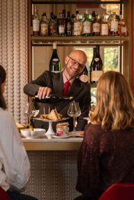 On pense alors à cette phrase du Grand Patron « himself » alias Alain Ducasse  : « La soirée au bar n’est pas un prélude au dîner, elle se suffit à elle-même. »  En effet, le déroulé des plats, célébrant la joie sans cesse renouvelée, nous projette vers des mondes de saveurs inouïs. Le service dans cet univers à la lumière douce sans être trop feutré, consacre des créations absolument remarquables : Saint-Jacques et radis marinés, miel de fleurs, citron mais aussi la sidérante courge japonaise, copeaux de parmesan. Quel bonheur. Les papilles frémissent plus que jamais à l’annonce de la fameuse cocotte lutée de bœuf braisé au Gamay. Les assiettes chaleureuses sont impressionnantes de précision. A ce titre, le riz de veau pané aux amandes, jus perlé que l’on déguste amoureusement nous laisse sans voix. Plus régressives mais tout aussi plaisantes, les coquillettes, comté, cancoillotte nous font venir un sourire de reconnaissance. Par-delà les fenêtres, le square apaisé Thomas-Jefferson participe de  cet état enveloppant de symbiose. Coté sommellerie, nous ne sommes pas déçus par ce choix avisé de cuvées parfaitement sélectionnées par Fabrice Langlois qui rend hommage au terroir et à la vigne dans des trouvailles aussi pointues que gourmandes. A savoir, la brillante IGP Côtes du Lot Néphèle 2023 du Domaine Laroque d’Antan, le sympathique Domaine des Bérioles pour le Val de Loire et le vibrant nectar « Hynotic » 2021 de E. Gagnepain & D. Risoul en Côtes du Rhône. L’exploration de l’éblouissante carte des vins ne s’arrête pas là car nous prenons la direction de la Vallée du Rhône avec un Hermitage de Jean-Louis Chave. C’est grand ! Sur cette partie dite « Raretés » de la carte, nous ne pouvons tourner le dos à la Bourgogne qui flatte notre palais avec un princier Chassagne-Montrachet 1er Cru les Caillerets de chez Jean-Claude Ramonet. Enfin, après avoir eu la chance de nous pencher vers la Corse (Sartène) avec le magnifique Alfieri Polidori San Micheli nous clôturerons notre soirée féérique avec une note de sucre venue de Sauternes : le Crème de Tête de Château Gilette. En quittant les lieux, on se dit que la soirée fut délicieuse, juste délicieuse !