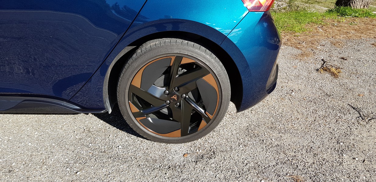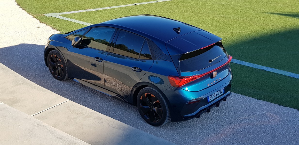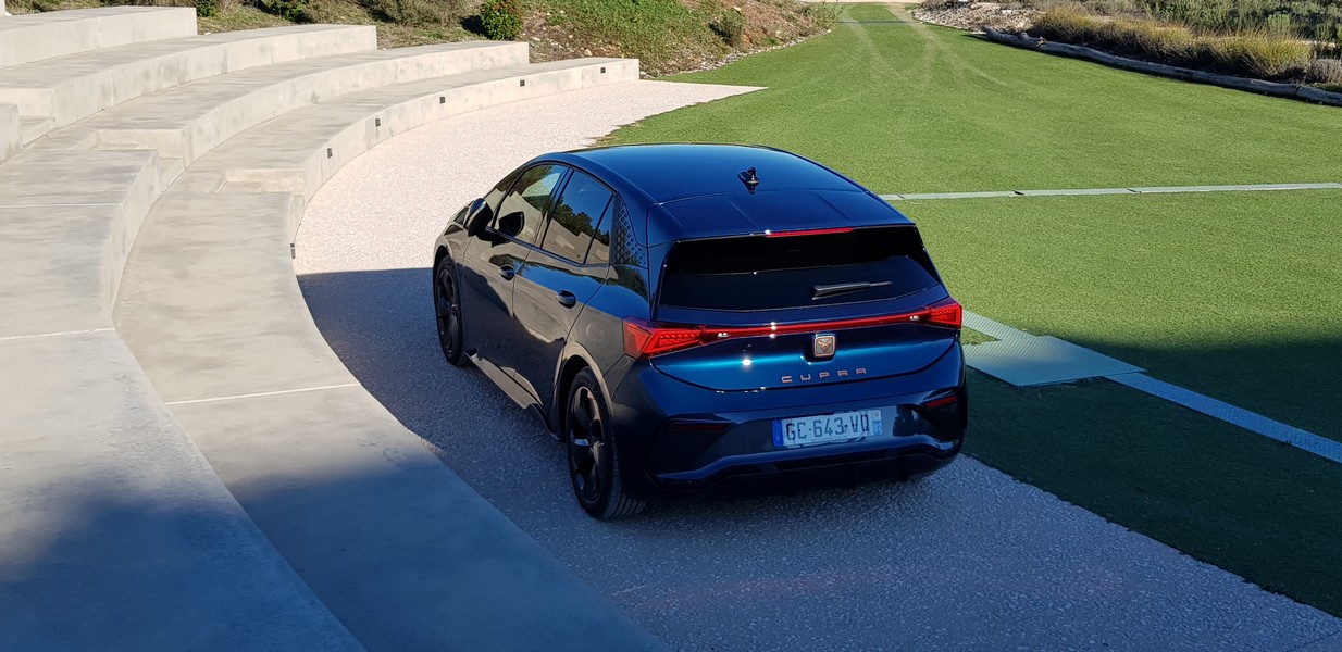 Arrière de la Cupra Born. Un léger roulis se fait sentir mais elle accroche bien la route.
