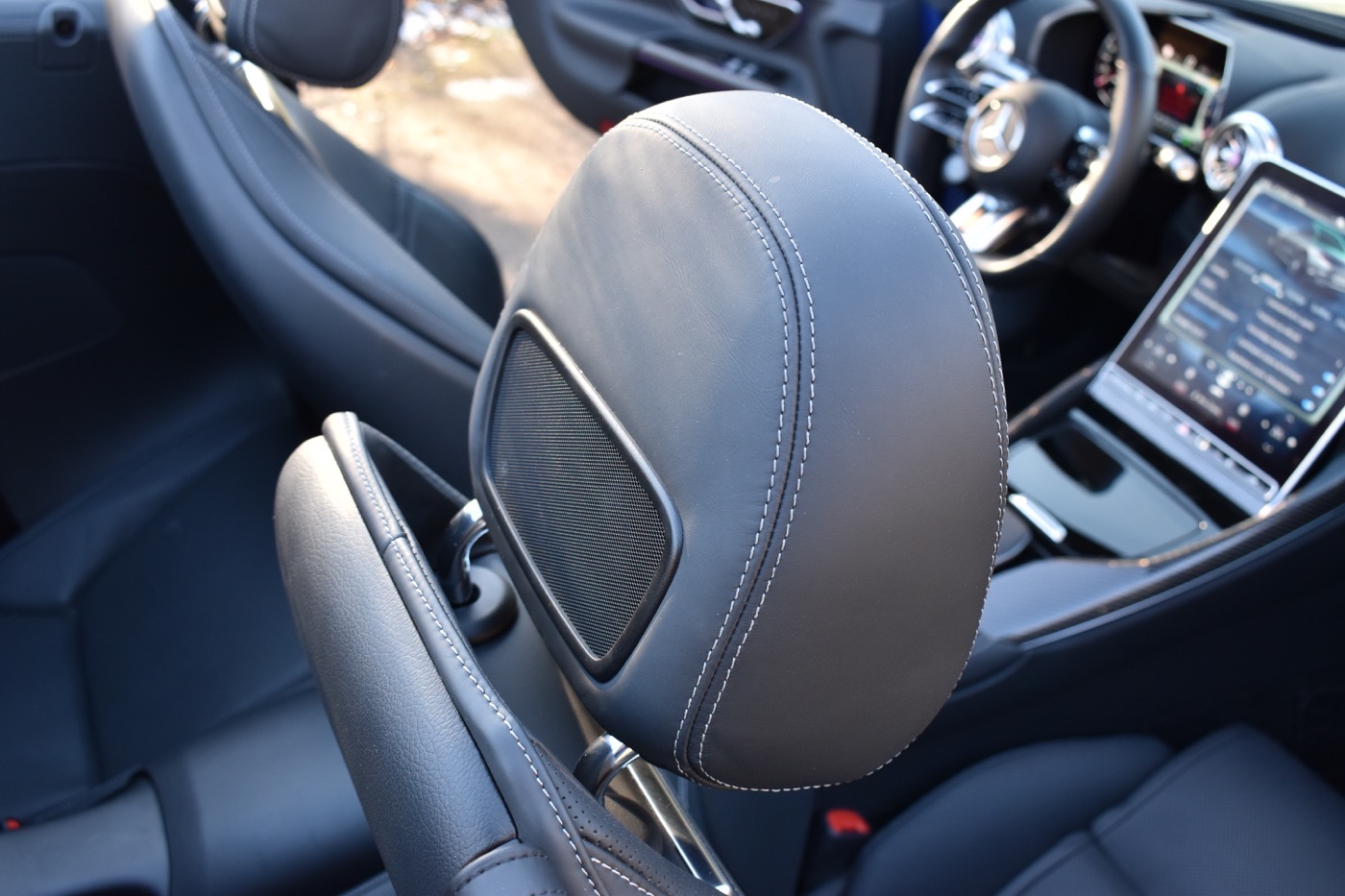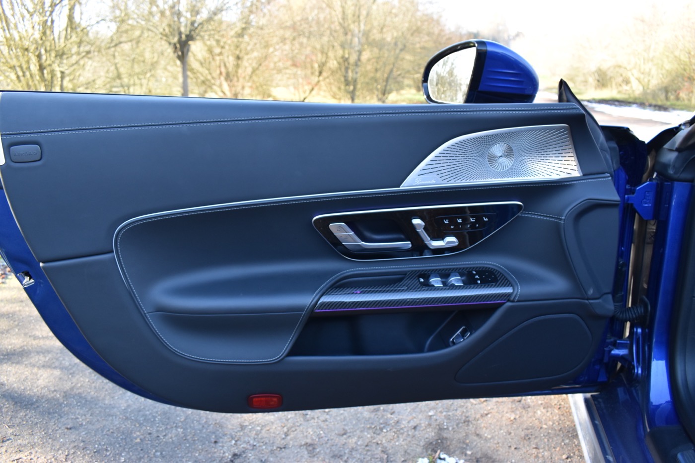 Au centre, une immense dalle de 11,9 pouces contrôle l’ensemble des fonctions de la voiture. Un écran orientable qui permet de ne pas être gêné par les reflets du soleil quand on roule décapoté. Bien trouvé. Parmi les innombrables fonctions, on remarque les sièges chauffants et climatisés, massant, ventilés à la nuque, le blocage de la boîte de vitesse en position manuelle, une pléthore d’habillages lumineux, un scanner à empreinte digitale, la sonorité performance AMG 810, un fabuleux système de sonorisation Surround Burmester®, un système de recharge sans fil pour smartphones à l’avant, un pack mémoire, l’aide au parking actif, un démarrage keyless et 6 modes de conduite (Sport, Sport+, Confort, Individual, Chaussée glissante, Race), entre autres.