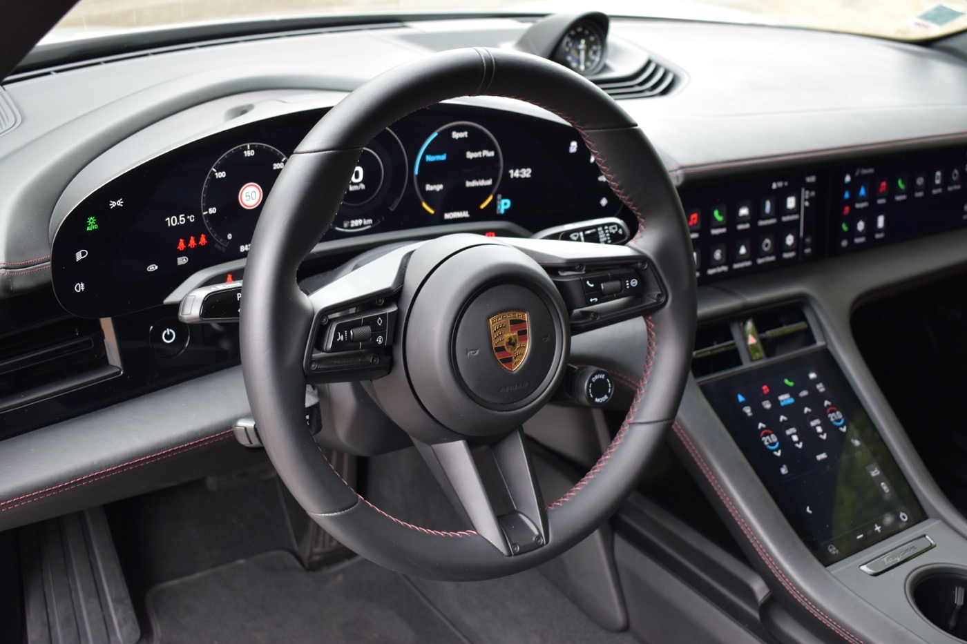 La direction est très rigoureuse et communique parfaitement avec le conducteur pour lui transmettre le profil de la route. Certes le poids de 2 170 kg se fait ressentir au freinage, qui reste très efficace sans être radical. Le train avant est vraiment réactif et incite à s’amuser sur les routes sinueuses. Le châssis est incroyable d’efficacité, surtout sur notre modèle d’essai doté du Porsche Dynamic Chassis Control Sport (proposé en option à 3 300 euros). Cette Taycan autorise le conducteur à rouler en mode sportif, dans un silence surprenant renforcé par le vitrage insonorisant de l’auto. Les plus mélomanes se feront plaisir en activant le système Bose, facturé en option à 1 362 euros.