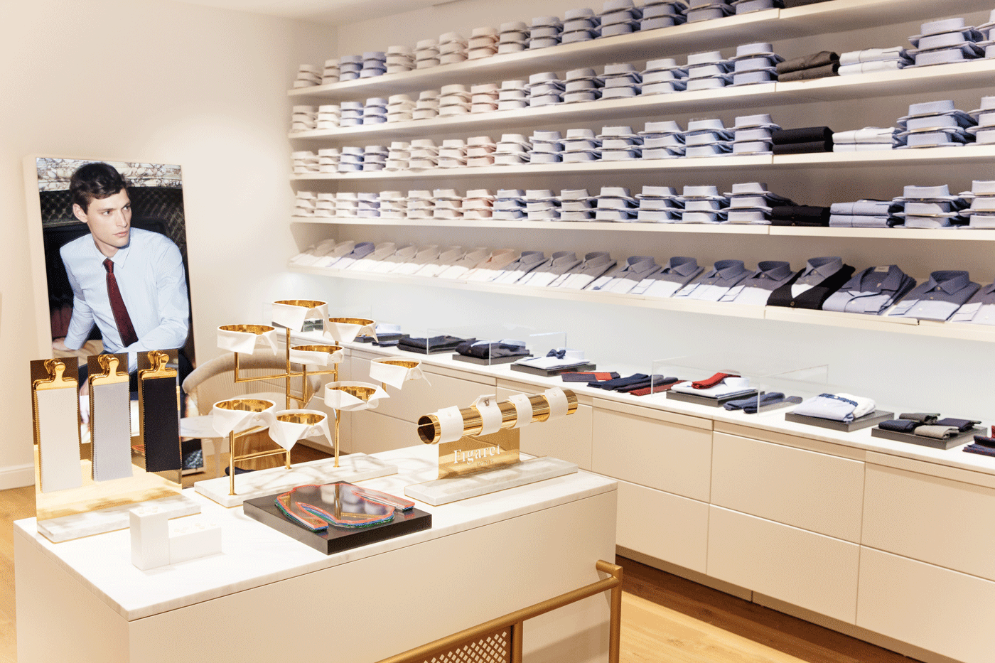 Entre moulures, marbre, vert Figaret et objets design, cet espace est pensé comme un appartement haussmannien, afin de vous plonger dans les codes de l’architecture et du chic parisien. Les univers masculin et féminin tapissent les 51 m2 de la boutique, comptant un linéaire de chemises homme de 7,20m qui caractérise l’expertise Figaret et offre plus de 260 modèles. Pièce emblématique de ce nouveau concept : un meuble central qui présente le savoir-faire de la Maison à travers une présentation des 8 cols, 3 coupes, 2 types de poignets et multiples tissus.
