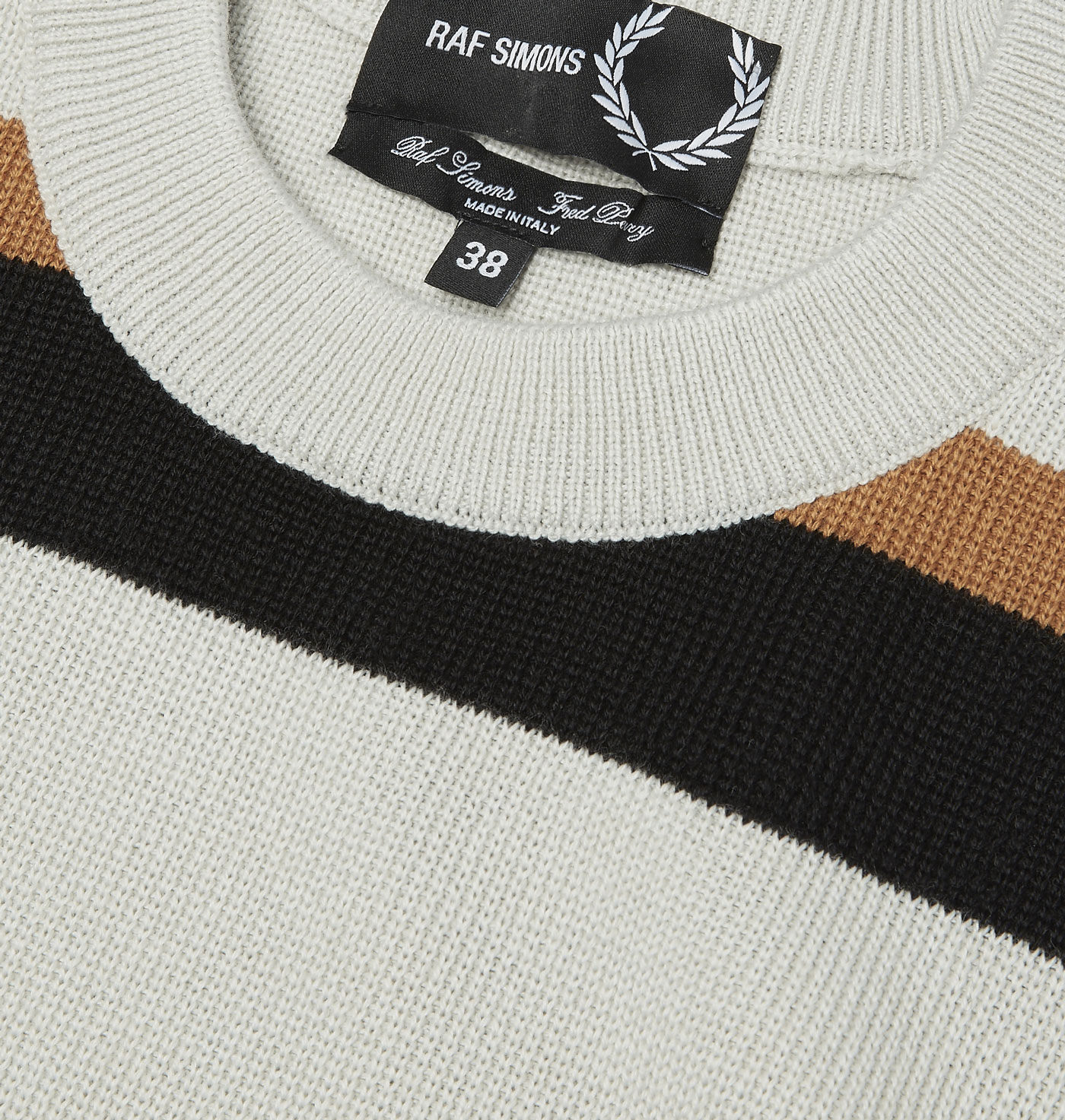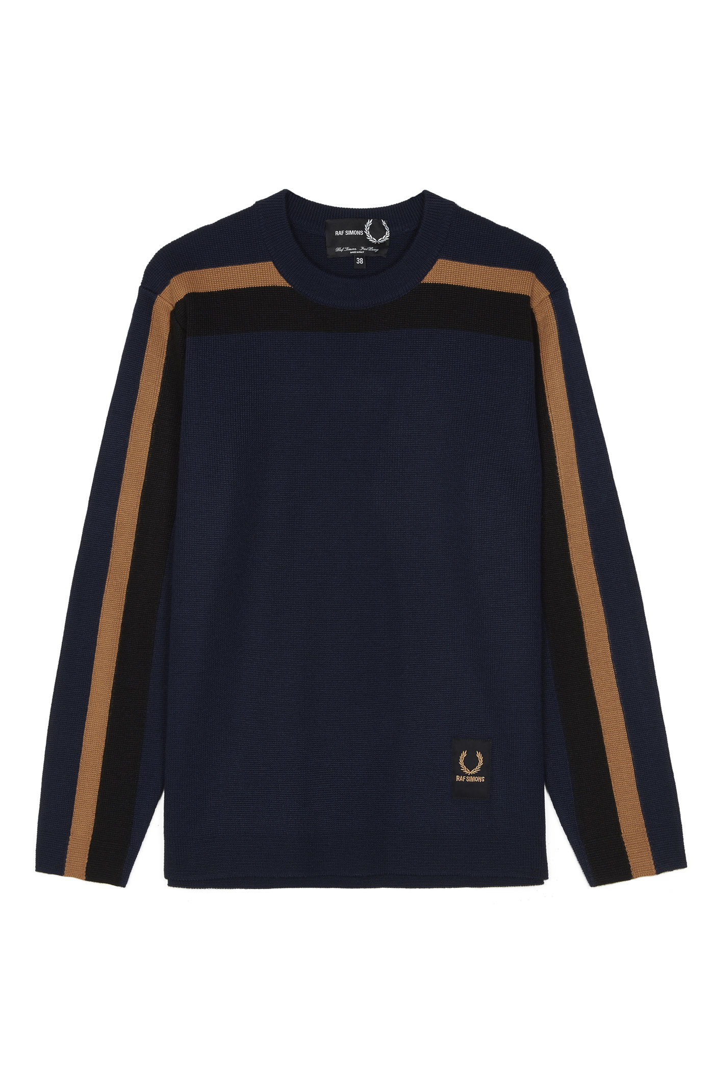 L’iconique polo Fred Perry est à nouveau réinterprété, par des détails pointus et contrastés qui se joignent aux cols, aux revers,et à la poitrine donnant ainsi naissance à des pièces élégantes et sophistiquées. Raf Simons forge subtilement votre silhouette grâce à des vêtements originaux et créatifs tels que le t-shirt manche raglan, les chemises rayées à coupe droite ou encore les gros bords côtes sur ses sweat. La facette minimaliste du créateur fait régner une atmosphère d’uniformité sur toute la collection. Il n’oublie cependant pas d’apporter une touche traditionnelle en utilisant des traits verticaux “signature” sur différentes pièces.