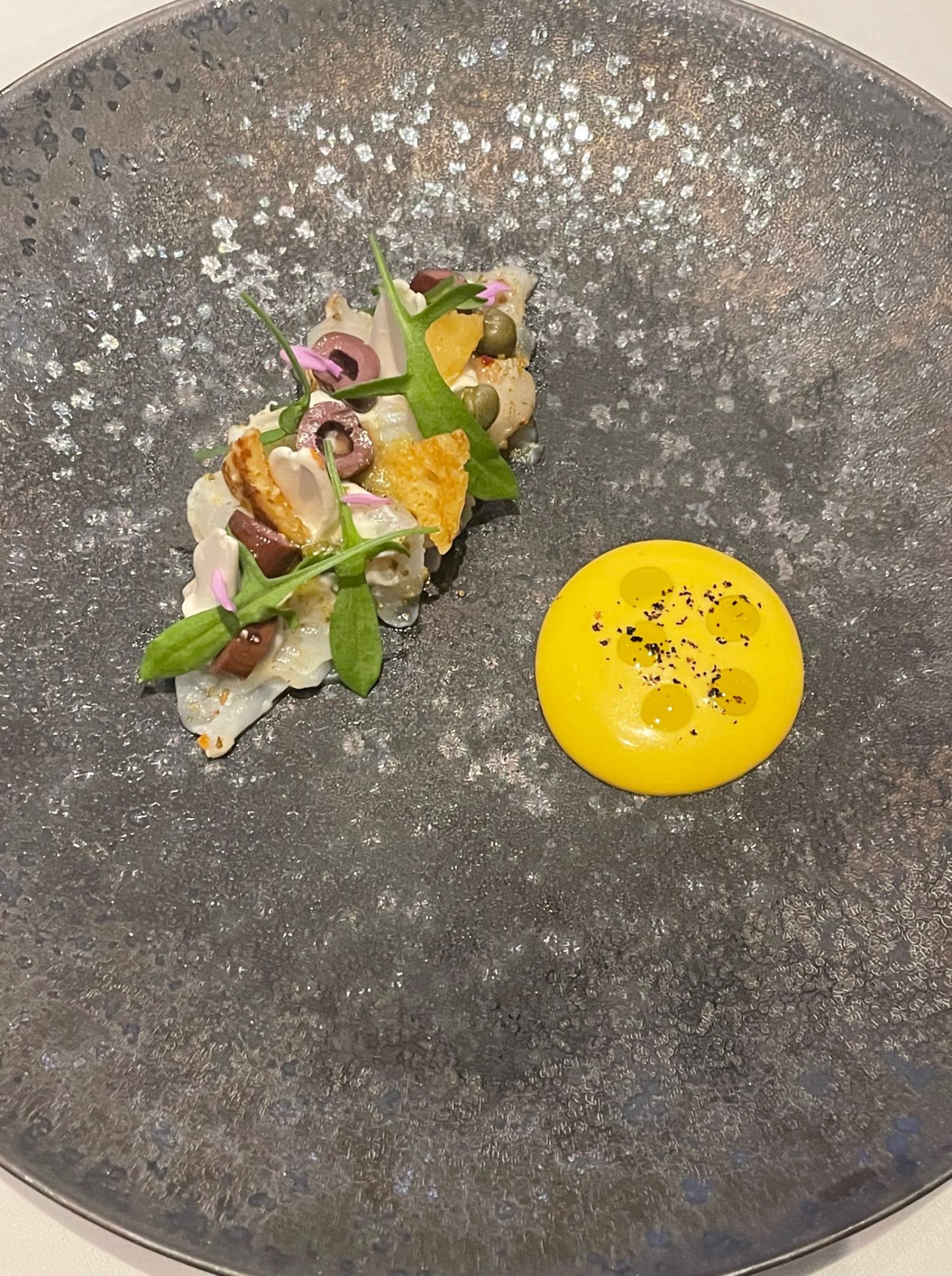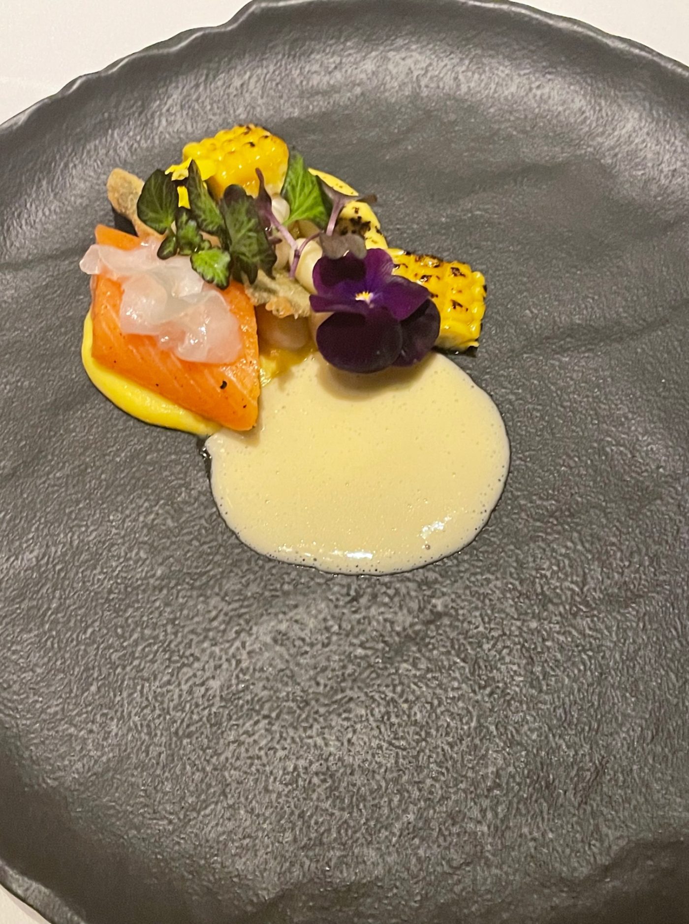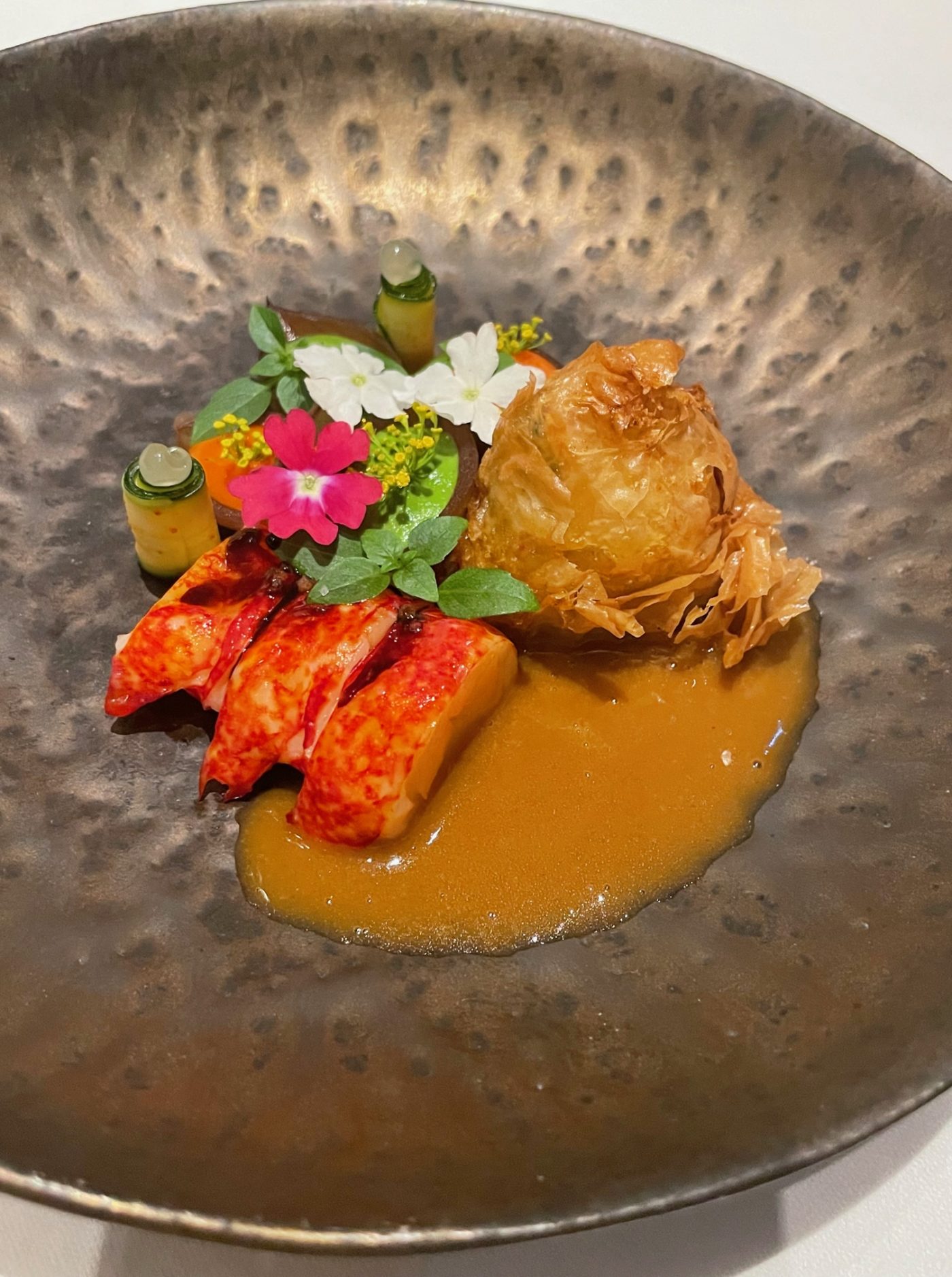 Les équipes, sous la houlette du directeur de salle Cyril Bruneau, sont souriantes et nous annoncent que l’expérience se fera en sept services en accords mets&vins. On est enchantés, notre esprit est en pleine ébullition dans ce décor signé par l’architecte d’intérieure Fiona Thompson. On embraye avec les engageants fruits de mer à l’ail noir pignon de pain et tomates. Nous entrons ensuite dans cette vision décalée du chef italien avec une ravissante dorade d’élevage Azurien qui convoque dans son sillage oseille, socca, condiment de Nice et safran. L’équilibre des saveurs est bien au rendez-vous dans cette séquence sans esbroufe. Le chef sommelier Anthony Haffner nous propose un surprenant vin du sud de l’Argentine 100% sémillon au coté salin, frais et minéral. Véritable explosion pour les sens, le vibrant homard Breton nous réduit au silence. On savoure les souriantes tomates Rabelais, basilic, vinaigre balsamique 100 ans Maison Giusti. Vu d’en haut et de près c’est beau. On salue également la maîtrise de l’assaisonnement. La belle énergie du service nous amène sur la providentielle truite Essonnienne et son lard de Colonnata, maïs, coco de Paimpol et sauce beurre blanc. Un vrai morceau de bravoure. On se pâme. Coté sommelier, on apprécie les notes tropicales d’un 100% chenin de la vallée de la Loire aux arômes de fruits jaunes et mûrs. Suivra un divin nectar de Bonifacio à faible fermentation sur peau. On a affaire aux meilleurs produits et cela est particulièrement plaisant en bouche. Notre palais communie avec le rythme de cette cuisine harmonieuse et joviale. La dégustation crescendo, ne manque pas de hauteur avec la venue d’un distingué St Joseph nous amenant sur les Coteaux Ardéchois et relève que le chef travaille les produits dans leur entièreté dans un souci écoresponsable mais aussi de goût. Les plats fort bien réalisés sont accompagnés à travers les saisons.
