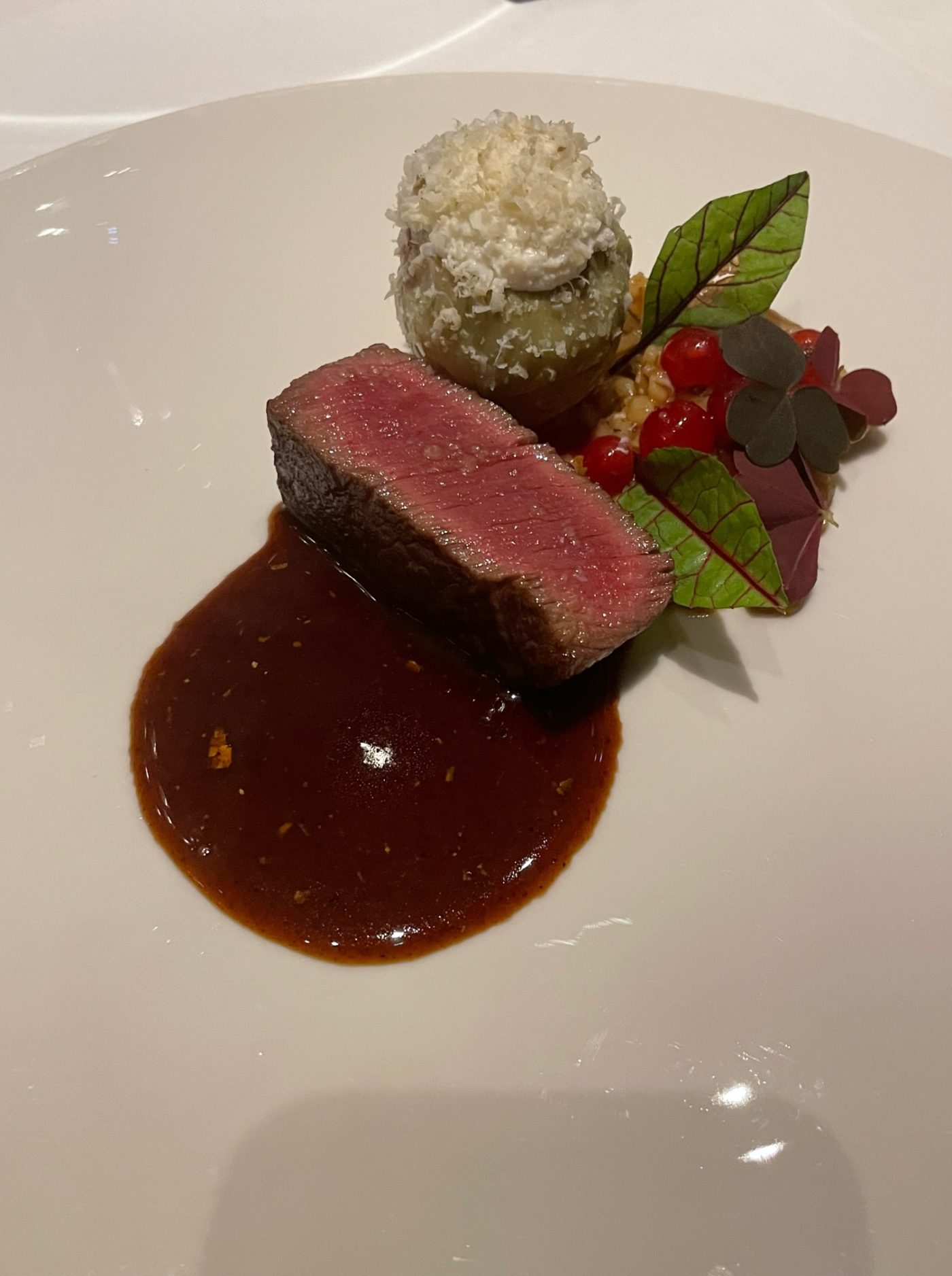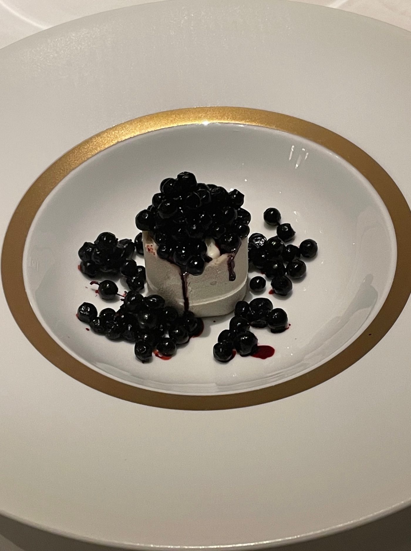 Le produit est roi comme le souligne l’arrivée du sublime filet de bœuf de salers qui nous secoue avec ses fulgurances soutenues par l’artichaut poivrade, la ricotta, le jus corsé au café d’orge et cardamone. Un fabuleux vin de Beaune 100% pinot noir nous livre ses secrets établis sur l’épice et les fruits rouges. La cuisine et la salle sont au diapason dans un fascinant spectacle de bonté et de générosité. Le savoir-faire des équipes en salle se décèle au guéridon et le dressage se terminent parfois à table. La merveilleuse sélection de fromages sur trolley nous comble. Le sorbet aux herbes qui lui succède fait bondir nos cœurs légers  et annonce les merveilleux desserts du brillant chef Pâtissier Eddie Benghanem. Ce dernier nous fait retomber en enfance avec ce tableau champêtre aux airs de petit paradis tout en douceur dévoilant ses adorables Myrtilles sauvages et crème vanille au fromage frais. L’instant léger et franc du dessert, qui ne déçoit guère est une leçon de choses. Il se clôt sur l’avenante apparition des Fruits de saison et berlingots à la vanille toastée, glace à l’huile d’olive. Bouleversant. En quittant cette table, divine et à la rigueur sans faille, on se dit que le chef en grande forme éblouit son monde à chaque bouchée. Il ne s’en laisse pas conter sur le terrain de la créativité. Et le service est aux aguets !