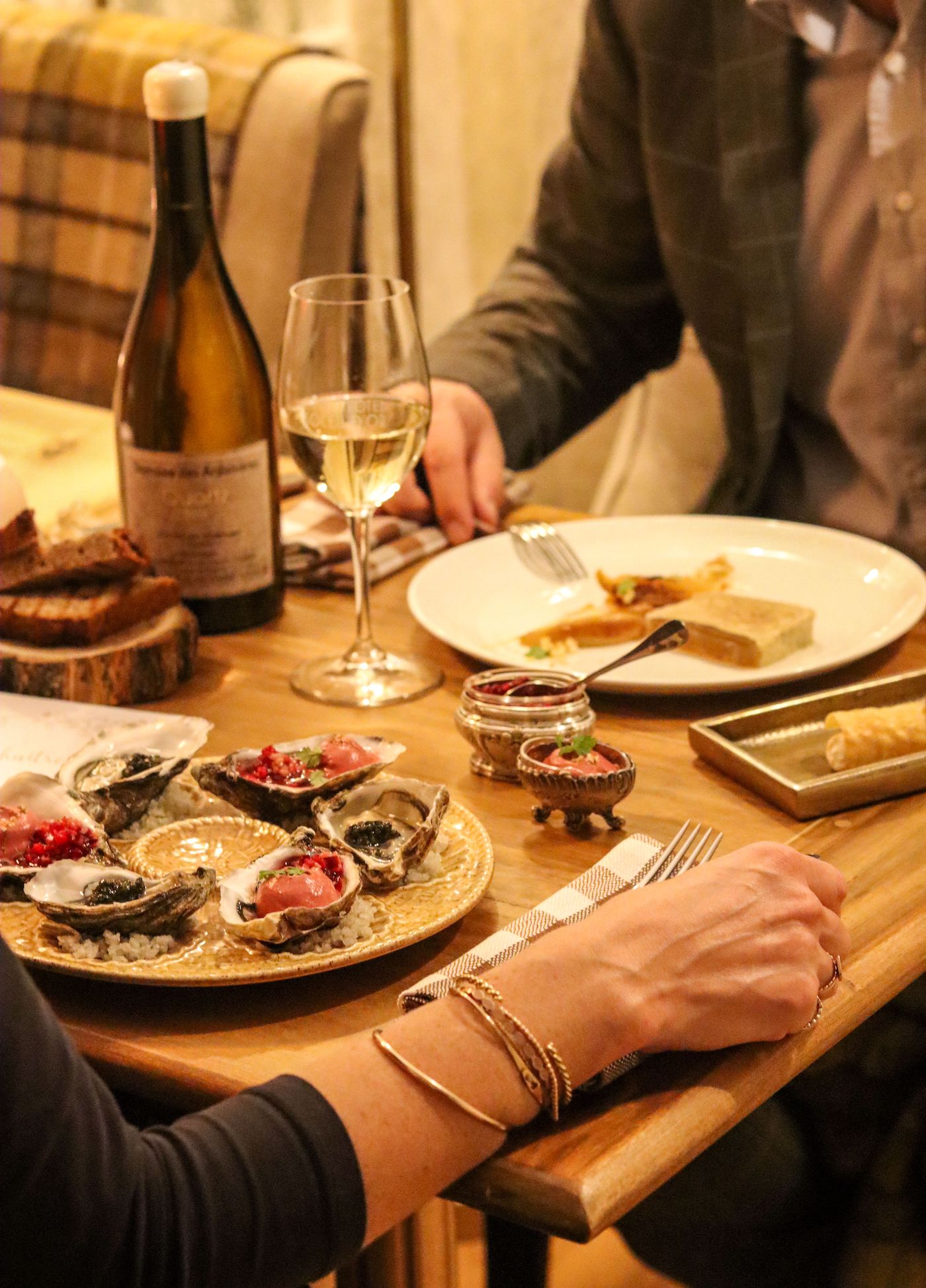 Le restaurant de la maison, salle hybride qui change de visage entre le jour et la nuit, est l’aboutissement d’une journée réussie. La jeune cheffe Mélanie Martin, surprenante de bonne volonté, parvient à alléger la gastronomie locale sans lésiner sur la gourmandise et la générosité. En fin de repas, elle convie sa cheffe pâtissière à une démonstration remarquable, afin que le client accumule les merveilleux souvenirs.