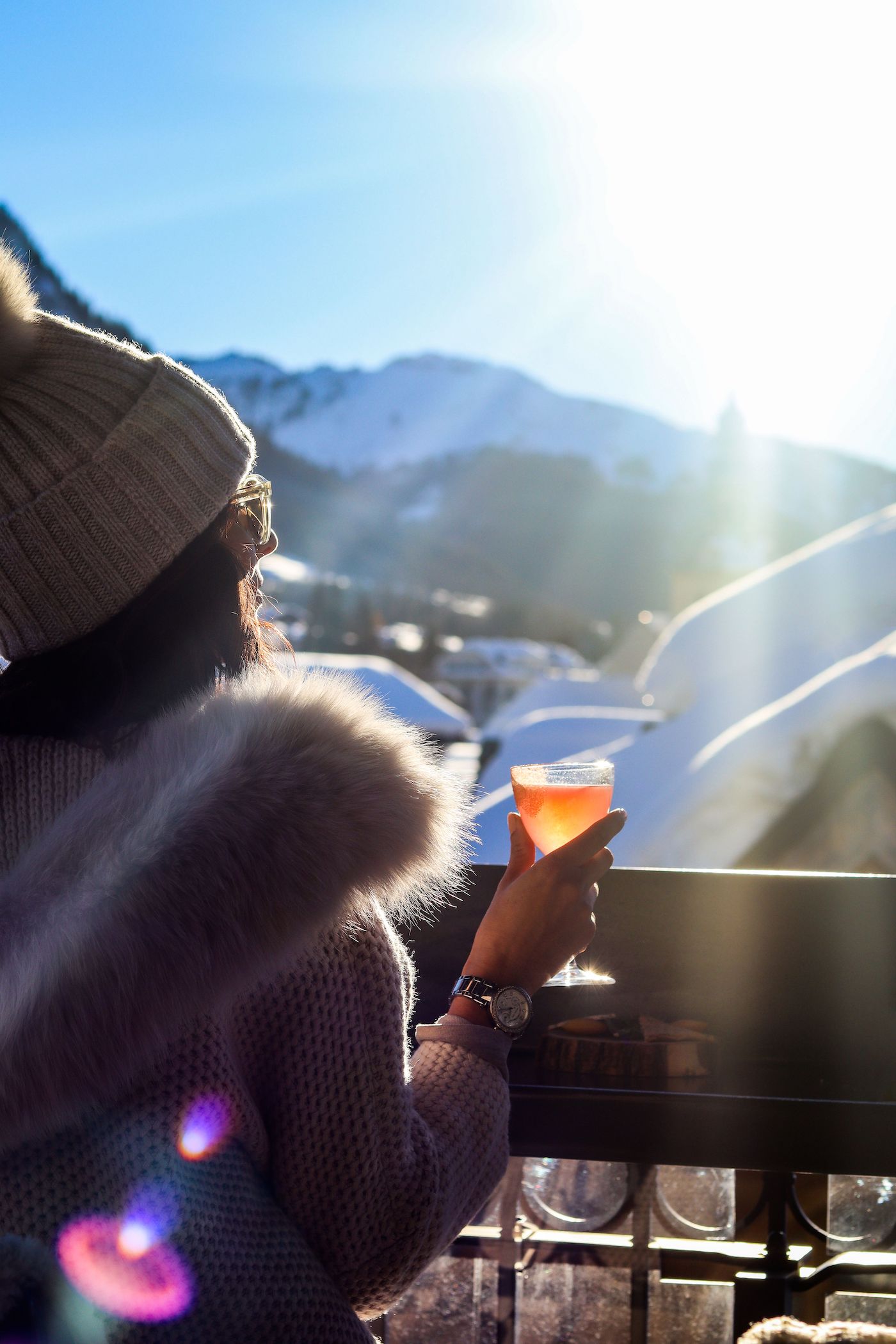Cocktail en altitude. La longue ascension alpine, autour de la chaleur et du réconfort nocturnes se poursuit au bar du rooftop, où la créatrice, décoratrice et antiquaire Marie-Christine Mecoen est allée jusqu’à remonter la fontaine du village et ses rues pavées, comme pour suspendre le temps.