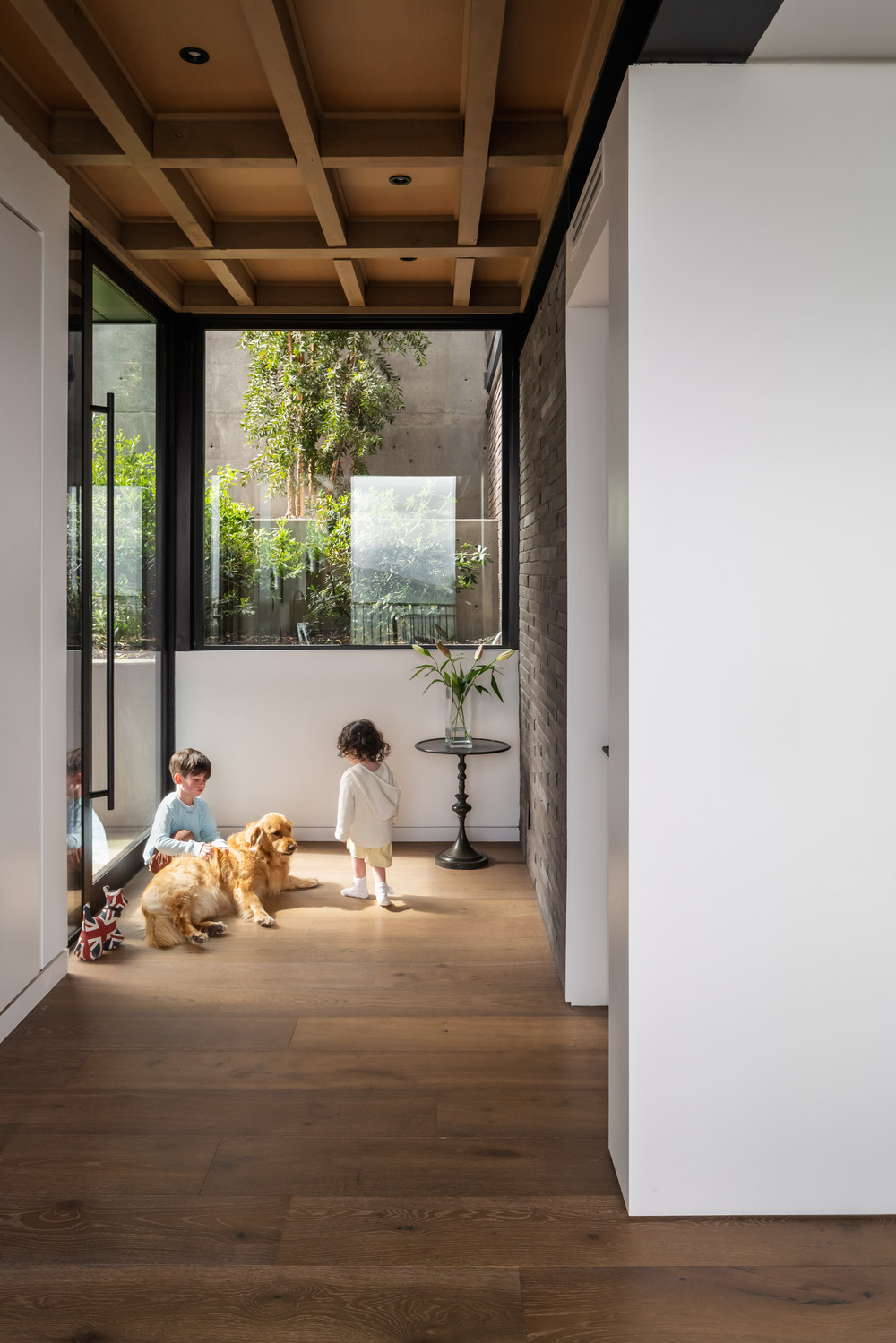 Visuellement et auditivement connectés, les trois niveaux de la maison sont unis par la fenêtre à fente verticale et le vide adjacent, dominés par une imposte sur le toit orienté au sud et une cage d’escalier menant au niveau de la piscine au nord. Le niveau intermédiaire comprend des espaces poreux et semi-autonomes, abritant l’entrée, le séjour, la cuisine, la salle à manger, le salon et le bureau. Au niveau inférieur, une suite d’invités et un espace de divertissement semi-fermé s’ouvrent sur la piscine, la terrasse et la pelouse, créant un espace idéal pour la détente. Le niveau supérieur accueille les chambres, la buanderie et le garage, offrant des fonctionnalités pratiques pour la vie quotidienne.