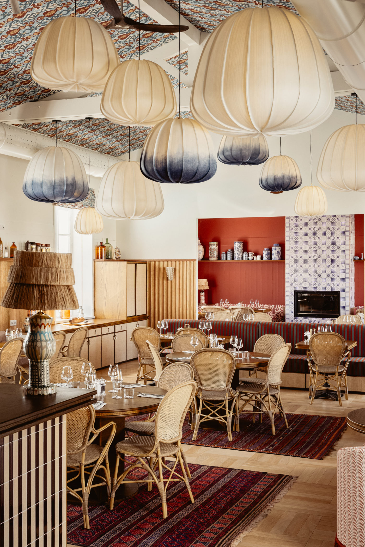 Les repas, du petit-déjeuner au diner, se situent dans une ancienne salle de cinéma dont on souligne l’importante surface d’origine. L’ancienne cabine de projection a été transformée en cuisine. Une collection de pichets en céramique, de bouteilles de vin et autres bibelots subtilement choisis, tapissent les murs. Le lieu dans son ensemble a été confié par la décoratrice d’intérieur Pauline d’Hoop, sensible au mariage des couleurs vives et du mobilier ancien.