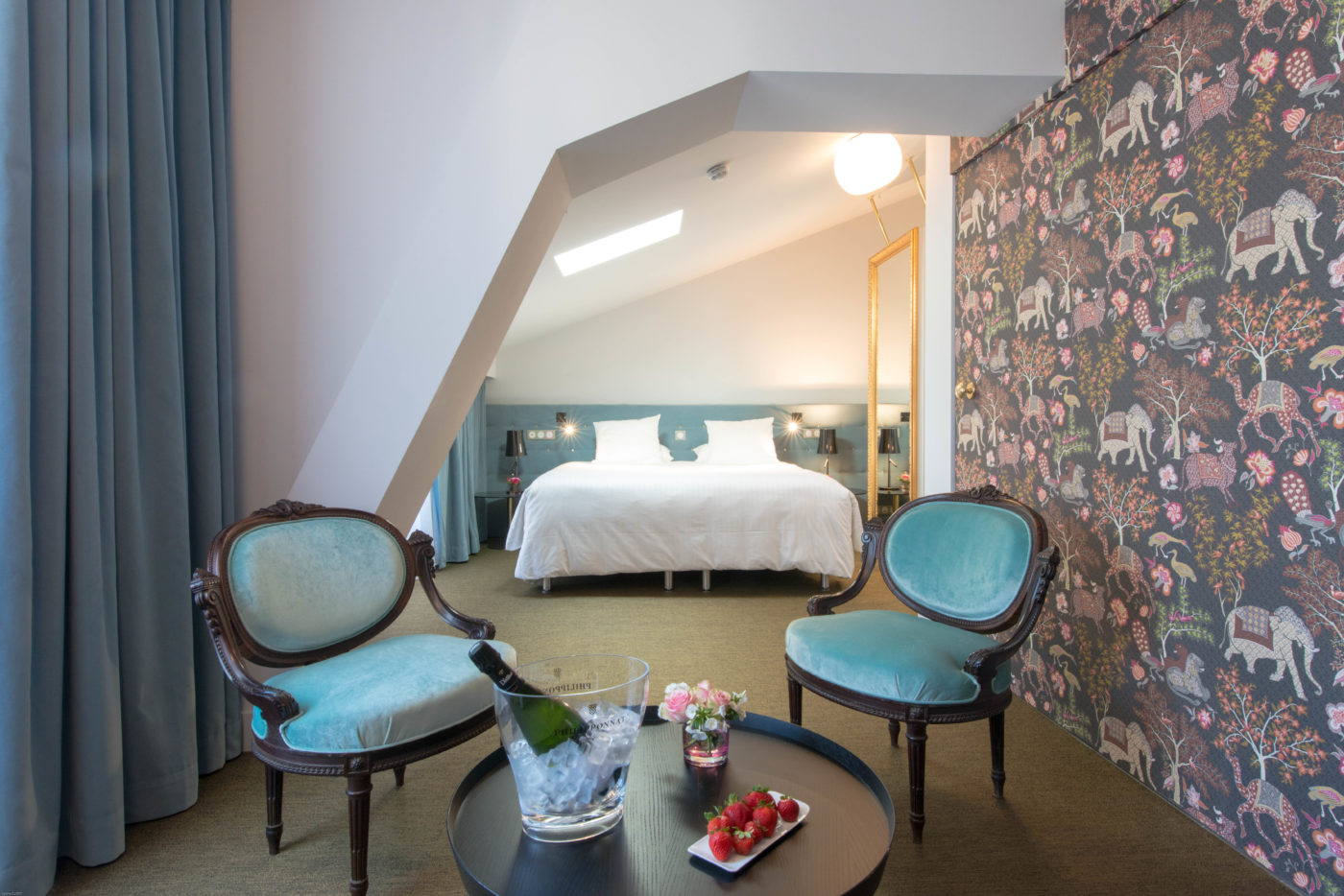Les chambres, de la plus petite (15 m2) à la plus royale, suivent ces mêmes critères artistiques et peuvent accueillir jusqu’à 4 personnes, dans le cas de la Suite Executive ou Sirène des Loges. Cette dernière se situe au troisième étage et jouit d’un atout capital : son rooftop secret auquel on accède par un escalier étroit. La terrasse offre un point de vue exceptionnel sur les toits de la Rochelle, la Tour de la Lanterne et laisse même deviner un bout du front de mer et du port des Minimes, sur l’autre rive. Aménagée d’une table à manger et d’un coin salon d’extérieur, le bain de soleil n’attend plus.