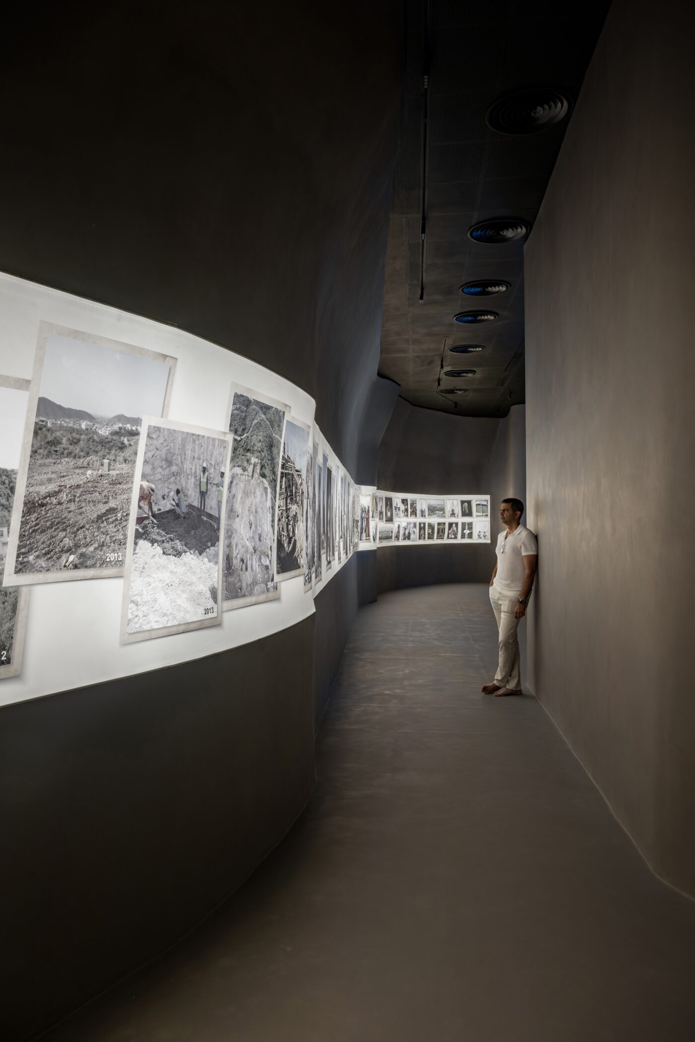 Les visiteurs sont conduits de cette entrée caverneuse à un étroit couloir ondulant avec des images illustrant la création du musée. Ensuite, chaque salle est entrée une par une, avec des thèmes différents transmis par des expériences audiovisuelles et immersives.