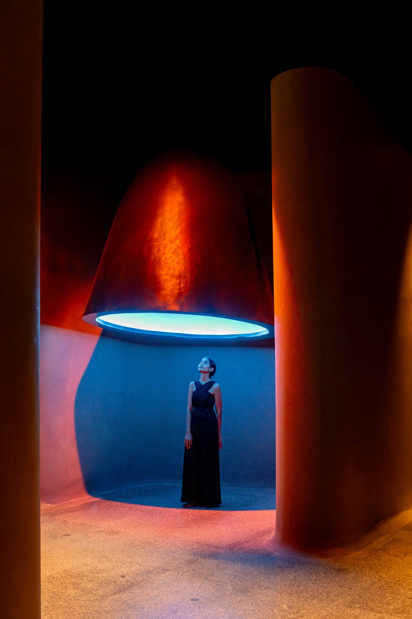 Ce volume sculptural, enveloppé d’un gris béton, apaise les visiteurs, les transportant dans un état de tranquillité avant d’entrer dans les 18 zones séquentielles qui ont été créées.