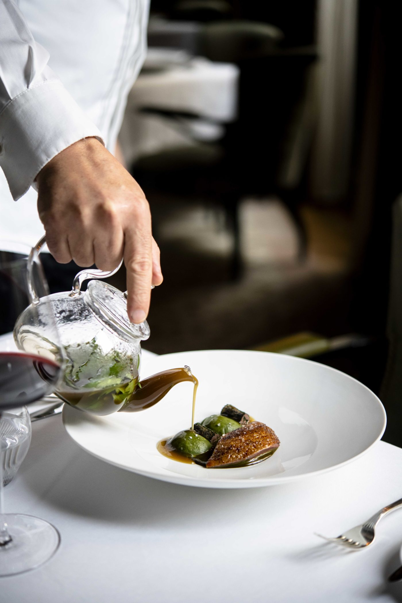 Bouleversés dans ce mélange des éléments, un vin espagnol, élevé à une heure de Séville et passé 15 années sous bois, nous dit que quelque chose se prépare de nouveau. Dans ses parfums de boîte à cigares et de camphre, ce nectar rare nous chahute dans ce voyage immobile dans un héritage de gastronomie française qui s’enrichit ailleurs. Le diablement beau Pigeon de Louvigné, raviole de faisselle, consommé à la livèche livre un accord de couleurs dans des tonalités qui sont comme un savoureux présage dans l’assiette. Le pigeon cuit sur coffre nous enchante tandis que la livèche nous évoque la bonté du céleri sans oublier l’épicé rayu. La corpulence d’un grandiose Cos D’Estournel nous permet d’honorer le côté sanguin du plat et la texture généreuse de l’ensemble. Enfin arrive l’instant doux du dessert en deux volets, sous l’amertume du pamplemousse et l’iode de la feuille d’huître. Puis le sarrasin, vinaigre de pomme et caramel au cidre. Les notes rondes de l’onctueuse vanille sont magnifiées par le chant magique d’un château d’Yquem 2011…. C’est cela Le Gabriel, une grâce venue de la vigne, de ses rituels mais aussi une alchimie née des territoires imaginaires de Jérôme Banctel qui prend pour guides les saisons mais aussi tous les amis producteurs, ses compagnons de voyage !