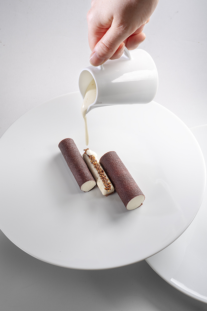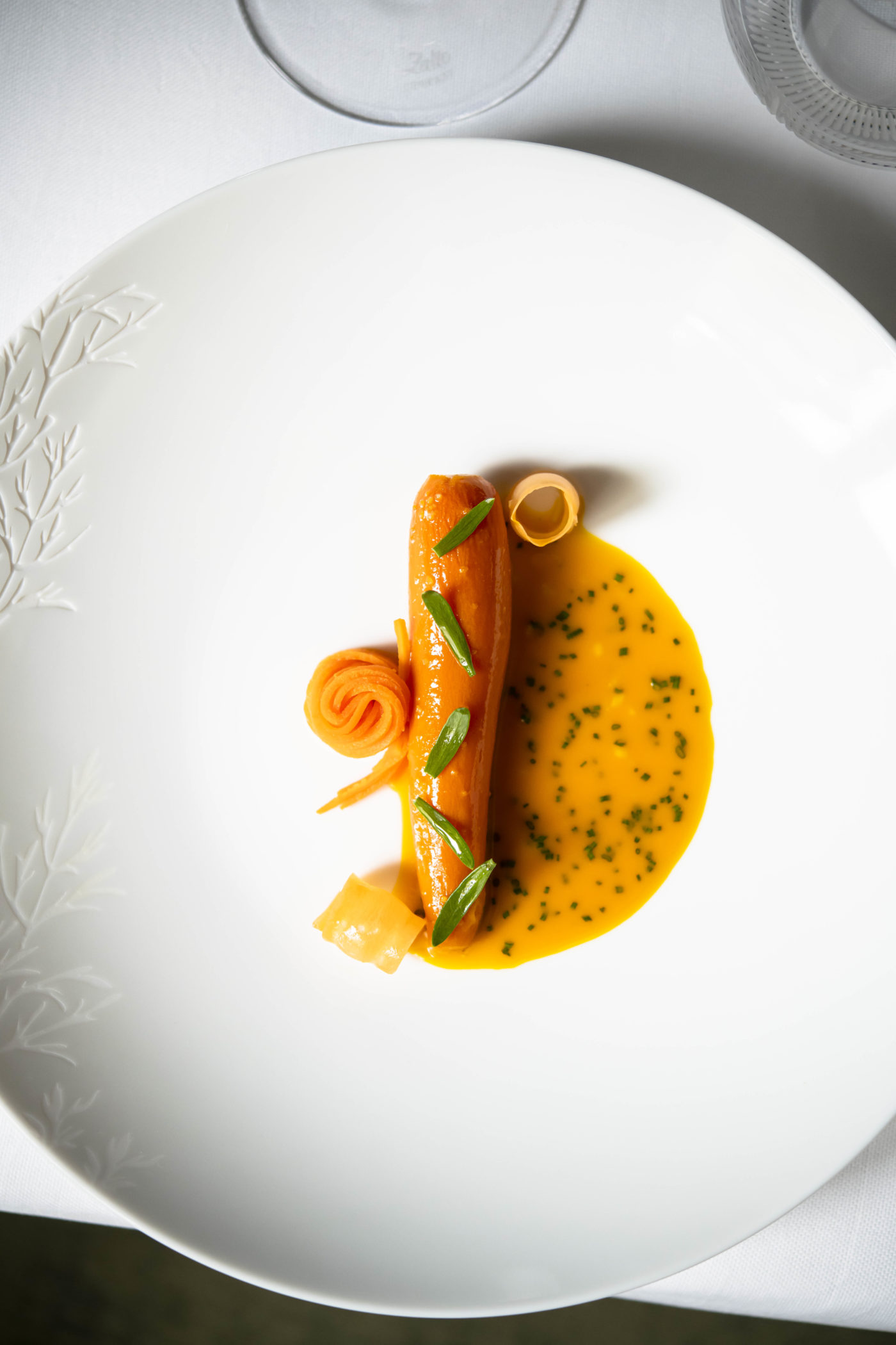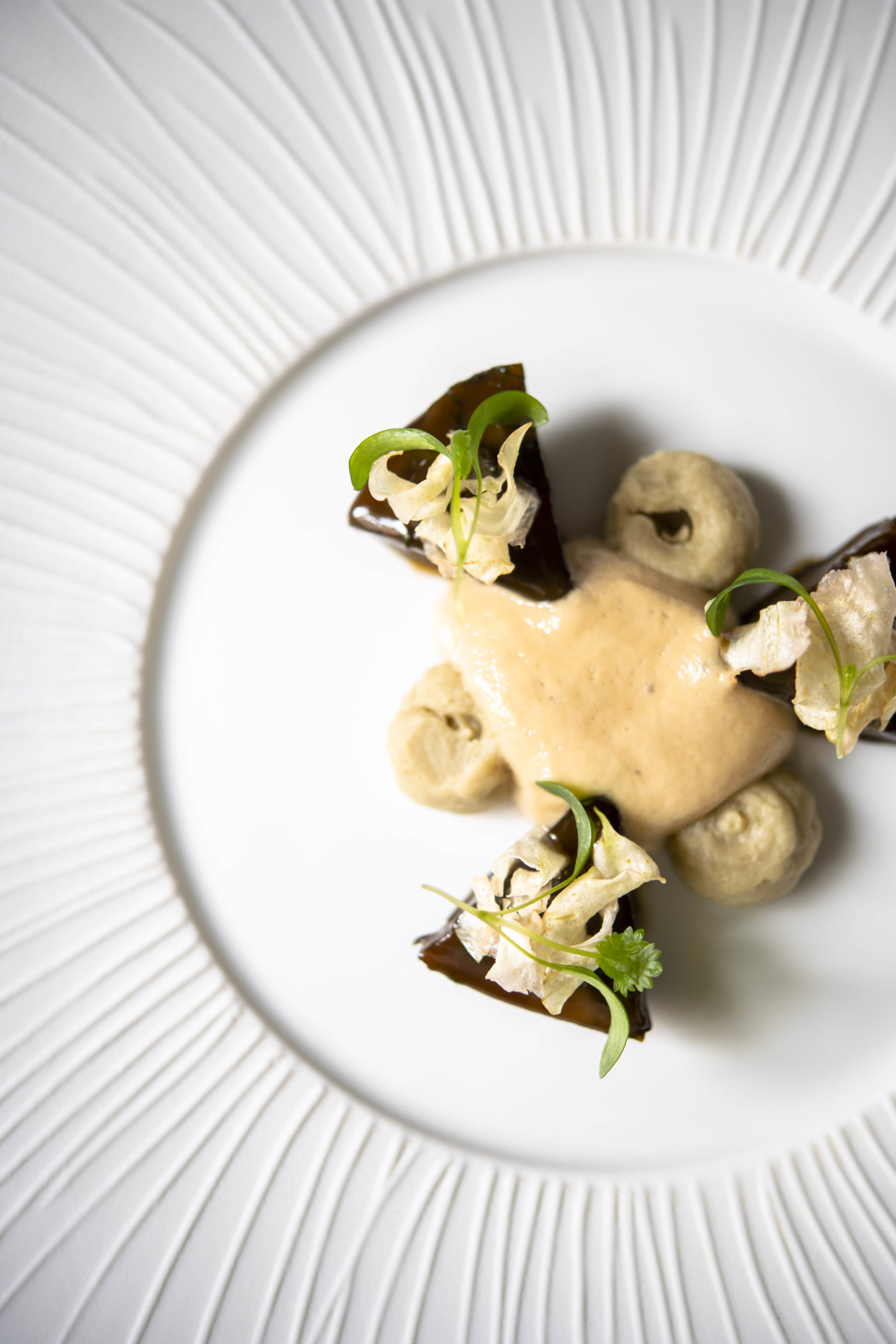 Le sommelier Gaétan Lacoste (passé par l’Hôtel du Palais, Lasserre et le Clarence) nous promet d’aller sur de l’exceptionnel et cela est de très bon augure. On opte promptement pour le menu La Virée en sept temps. Ce dernier nous embarque vers la Bretagne natale du chef dont le souvenir du travail de la terre et de l’iode omniprésente façonne encore son rapport à la gastronomie. La ravissante et lumineuse Carotte des Sables jouant de son enveloppe confite et de son jus acidulé de gingembre nous emballe sous un saké pur et rocheux à 55% de grains de riz poli. Survient alors le délicat Artichaut à la chaux et vinaigre sakura qui fait son entrée remarquée. Ce plat relevé par un vinaigre à base de fleur de cerisier et la technique de la chaux vive (technique ancestrale découverte en Turquie pour conserver les saveurs) nous emporte avec un riesling trocken sans sucre venu des plus beaux terroirs en Allemagne .