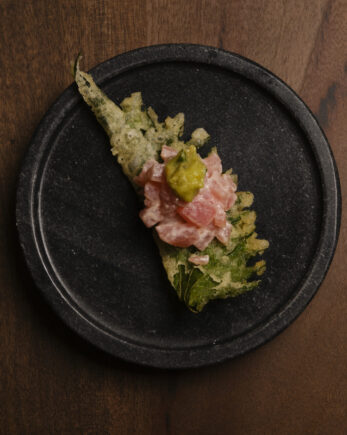 Durant le dernière fashion week, la Maison Dior figurait sur les listes Vip les plus choyées. Nous sommes accueillis chaleureusement par le très chic directeur Maxime Brousse (passé par le Victoria Paris du MOMA Group) avant que le Manager Jean-Baptiste (qui a opéré un temps à la Maison du Caviar) nous accompagne à notre table. Nous entamons notre belle dégustation en suivant les recommandations avisées de la cheffe de rang Emma. Impossible de découvrir « Kinu » sans plonger dans la carte des cocktails. Pour nous, ce sera le Kyuri Margarita. On adore ce surprenant mélange de téquila blanco, concombre, sirop d’agave, jus de Yuzu et citron vert, wasabi (19 euros). En guise d’amuse-bouche, on opte pour la galette craquante de thon, tarama à la truffe d’été et sauce yuzukosho. Une merveille de douceur dans une merveilleuse superposition de saveurs. Avec cela, coté Tempura, les fameux broccolinis sauce tahini ponzu et le divin starter Shishito Perrers sauce miso. En parallèle, les Edamame aiguisent l’appétit dans une joyeuse gourmandise. Sur notre confortable banquette d’angle en velours, on savoure cette entrée en matière 100 % « Nikkei  » des plus engageantes.