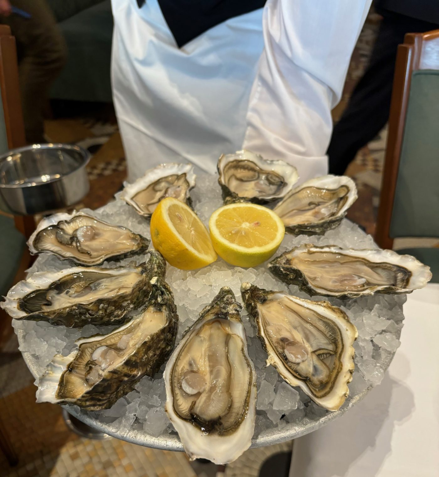 Il y a comme une sorte d’affection profonde qui émane de cette adresse aux airs de paquebot de plaisir de Montparnasse, et ce, dès la terrasse où les clients profitent, aux beaux jours, de cette atmosphère empreinte de gaieté et de légèreté. A notre arrivée, le directeur du restaurant Laurent Mouzat nous accueille avec chic et décontraction, sans trop en faire, dans le bon ton de la légende. Depuis son rachat en 2017, par le groupe Bertrand, l’établissement mise sur un retour aux sources et on a hâte de faire l’expérience de ce « revival » dont tout le monde parle. On passe à l’attaque avec 9 huîtres Sentinelles N°2 venues d’Irlande. Une pure merveille. Toute cette iode nourricière nous revigore en nous ouvrant les portes de la félicité.