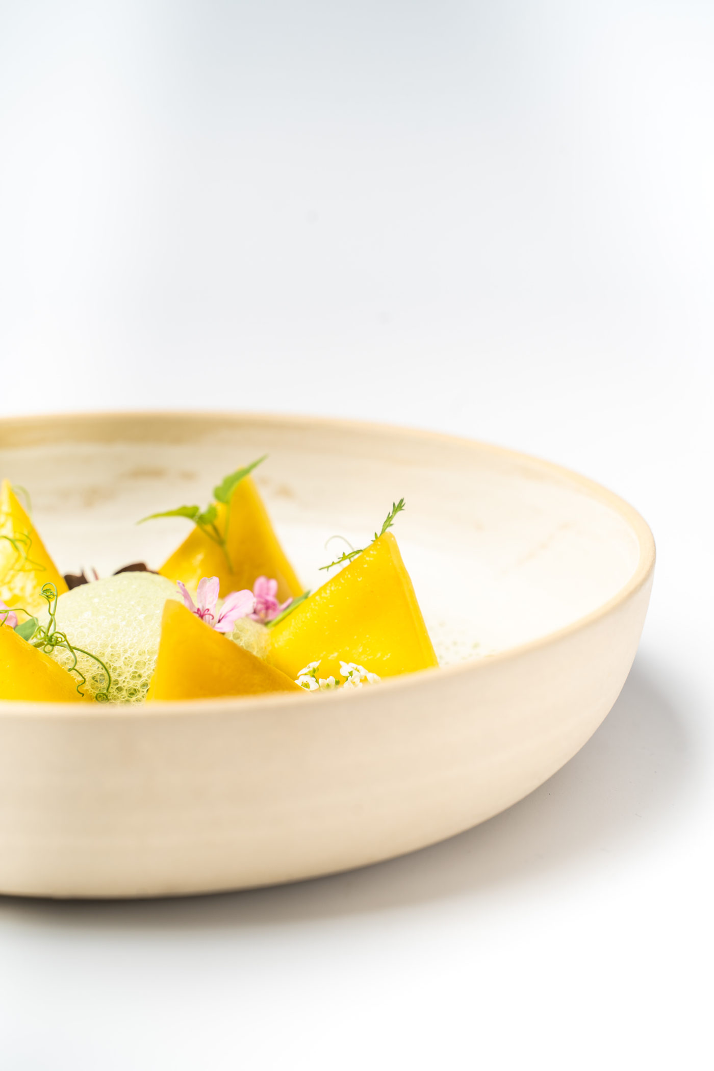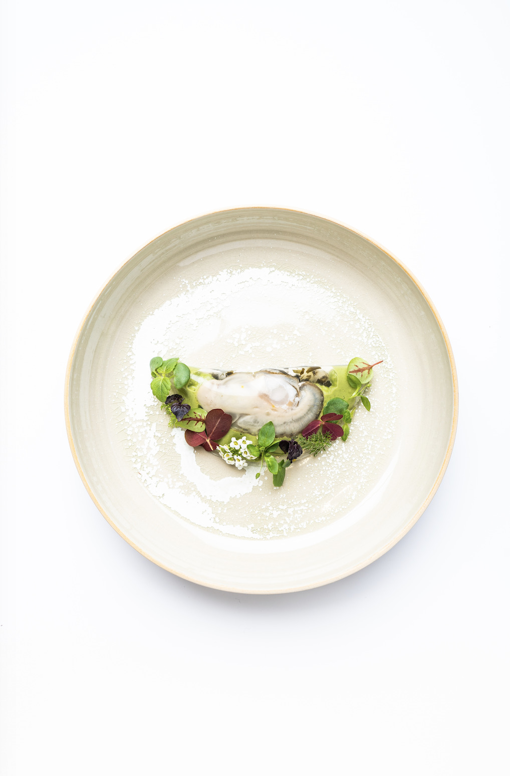 Intrinsèquement liée à des valeurs familiales et une histoire de transmission sur quatre générations, la cuisine-récit de Anne-Sophie Pic est marquée autant par un perfectionnisme aigu ainsi que par la réminiscence de promenades et de voyages aux quatre coins de la planète. Seule femme cheffe en France à détenir trois étoiles, elle fait se rencontrer en profondeur les meilleurs produits qui s’épanouissent dans un art de la métamorphose unique : « Plus qu’un simple terme technique, l’imprégnation est une pensée qui regroupe plusieurs gestes et préparations. Elle est plus proche de la philosophie, ma philosophie de la cuisine au sens large. » Sous la gouverne des émotions et dans la magie de l’instant, sa cuisine décomplexée fait évoluer constamment sa trame aromatique tout en équilibre. Se jouant des frontières, elle met en lumière un caractère épicurien dans d’heureuses associations multiples explorant toutes les dimensions du goût. Pour mieux comprendre ce cheminement traversé par l’audace et la libre expression, on part sur le menu déjeuner en cinq séquences conduit par la maestria du chef exécutif Jordan Theurilat. L’Huitre Tarbouriech, sous crème glacée au combawa et shiso pesto à l’oseille et à la pistache livre une troublante fraîcheur soulignée par le dry martini sans alcool ( distillat aux agrumes, sirop de sencha et citron vert). On prolonge ce premier instant de félicité par la célèbre spécialité du Berlingot aux champignons au kombu rôti et algues marines dans un accompagnement bienvenu au thé Gyokuro (thé vert japonais le plus noble de Kyoto) sous la suggestion avisée de la cheffe exécutive sommelière Paz Levinson. Règne alors un vif crépitement dans le palais.