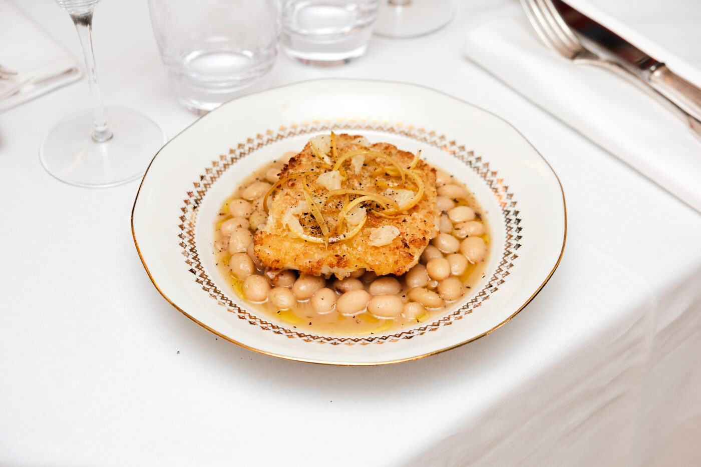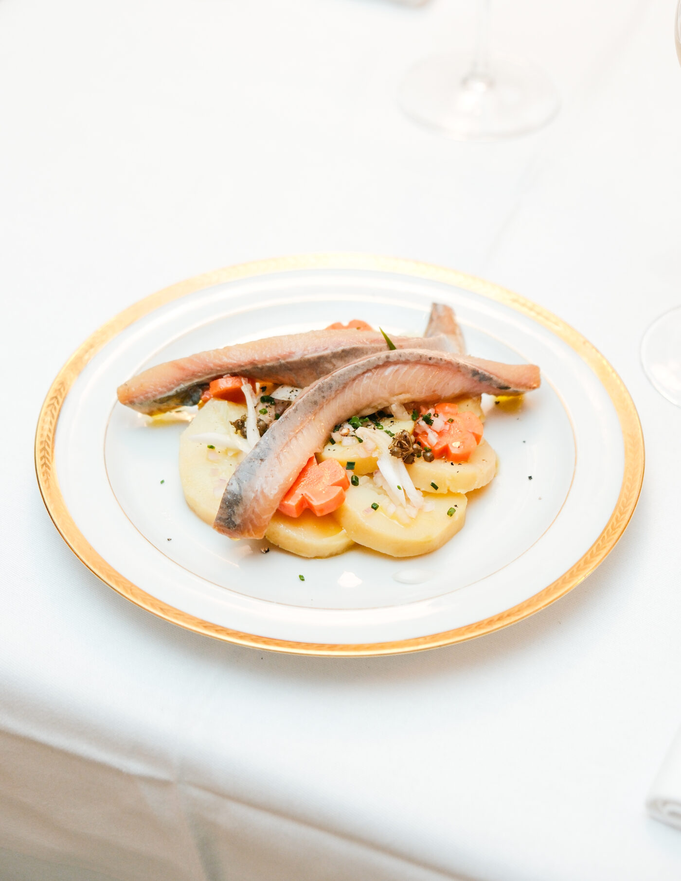 La fille et petite-fille de cuisiniers, aux origines fièrement lyonnaises, affiche un profil de choix. Nous sommes accueillis, dans le sourire, par la cheffe hôtesse Nesrine Boumédiene et le directeur de restaurant Amir Enu qui nous trouvent une belle place proche des cuisines. On se lance dans notre exploration culinaire, en faisant abstraction des hors-d’oeuvre et en commençant par deux plats de partage aux recettes emblématiques, à l’aura statutaire, ne tolérant pas d’approximation. Les ravissants escargots de Bourgogne Persillés en Coquilles illuminent l’assiette et nous disent que la cuisine traditionnelle n’est pas ennemie de la modernité. Autre incontournable, les harengs, pommes à l’huile, offrent, eux, au regard une assiette haute couture construite autour de l’idée du bien manger. On est séduits. Il y a quelque chose d’informel, de joyeux et festif dans ce plat d’amour. Le chef Sommelier David Rougier (passé par le Meurice du temps de Yannick Alléno, le Bristol et qui fut propriétaire, encore récemment, des deux bars à Vins l’Etna et le Coup d’Oeil dans le 11ème arrondissement) nous soigne avec le Pinot Auxerois Vieilles Vignes de la magnifique maison Josmeyer. Dans ce chaleureux cadre Art déco, signé par l’architecte d’intérieur madrilène Lazaro Rosa-Violan, on poursuit l’expérience avec deux entrées individuelles aussi exigeantes qu’immanquables sur la scène gastronomique française : le divin oeuf meurette parfaitement réalisé et le merveilleux Carpaccio de Saint-Jacques, agrumes et passion.