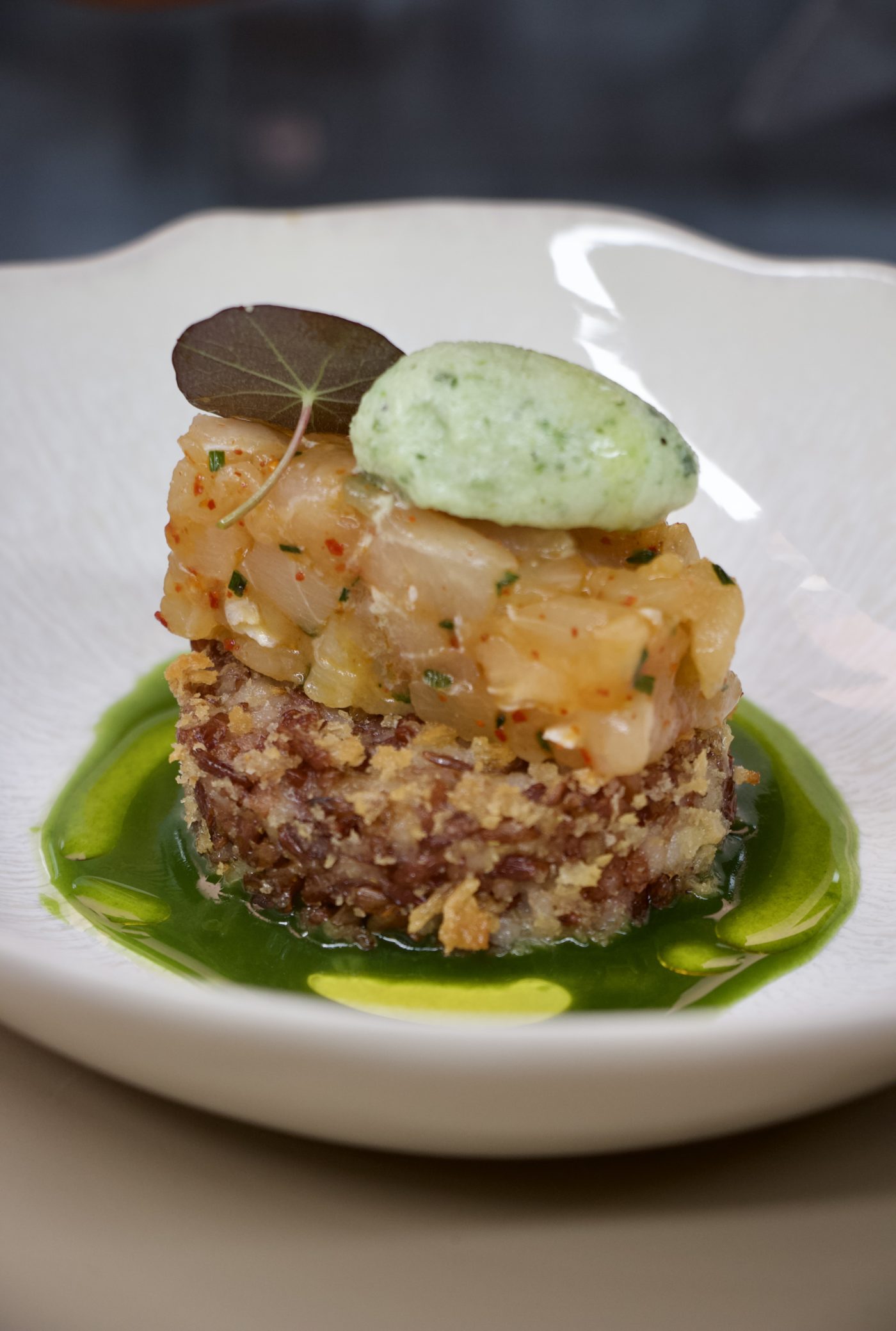 L’entrée s’apparente à celle d’une ancienne finca espagnole, cernée de ses murs corail façon terre cuite où un bouquet de fleurs plane au-dessus de la carte. Le menu est d’ailleurs à l’image de ce lieu à demi-insolite, affirmé et sans complexe aux influences méditerranéennes prononcées. L’un à 45 euros, s’intitule : « Je fais ce qu’il me plait » et prévoit quatre « surprises ».  Un autre à 75 euros, nommé : « Tais-toi et laisse-moi faire » en prévoit six.