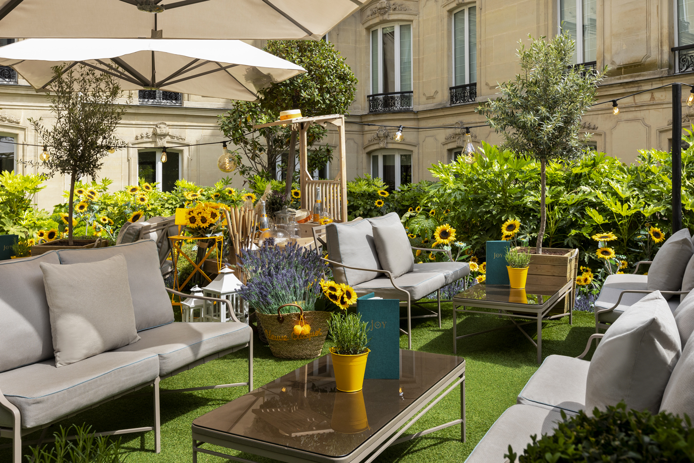 Le jaune vif des tournesols illumine la terrasse du restaurant Joy jusqu’à la fin des beaux jours. Des brassées de lavande, des paniers d’osier et une bicyclette ajoutent à la touche bucolique de ce décor estival éphémère signé Veuve Cliquot.