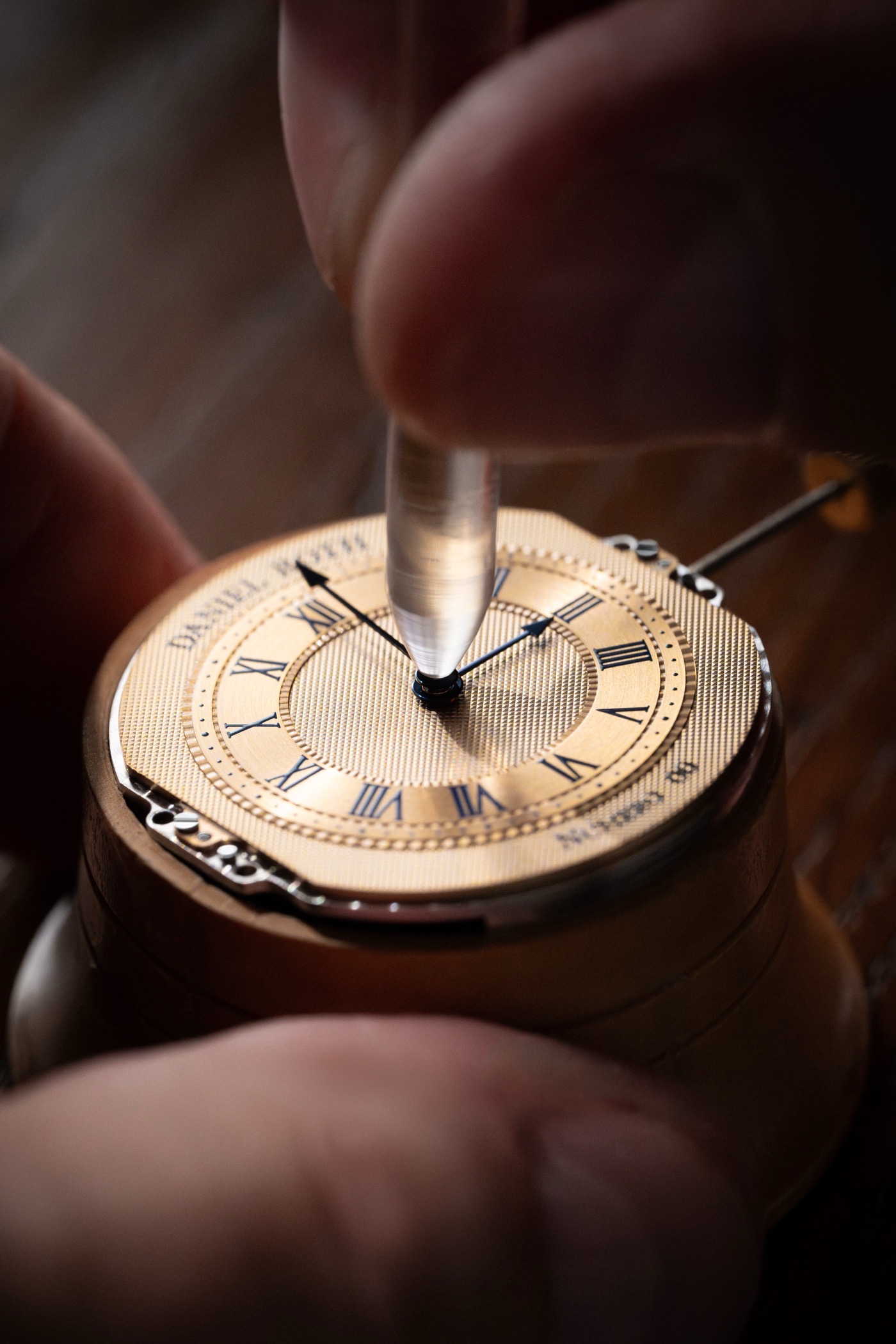 Ce garde-temps à l’esthétique raffinée arbore un boîtier en or jaune 18 carats et un cadran assorti guilloché à la main d’un motif Clous de Paris, de 35,5 mm de large sur 38,6 mm de long. Pour lui donner un profil plus équilibré, la double ellipse se pare désormais d’un godron parfaitement centré tandis que les cornes délicatement incurvées assurent une ergonomie optimale. Dans un souci de perfection, chaque corne a été façonnée séparément puis minutieusement soudée à la main une à une sur la carrure du boîtier. Le cadran guilloché s’inscrit également dans le plus pur savoir-faire artisanal avec une guillochage réalisé à l’aide de machines anciennes restaurées. De même le motif Clous de Paris a été obtenu au moyen d’un tour à guillocher à ligne droite actionné à la main et datant d’environ 1935, tandis que le filet sauté visible sur le tour d’heure a été exécuté avec une machine des années 1850. Pour faire échos aux aiguilles bleuies thermiquement, les inscriptions qui figurent sur le cadran sont teintées d’un bleu intense. Quant au calibre, conçu par La Fabrique du Temps Louis Vuitton pour Daniel Roth et créé de toutes pièces pour le modèle Extra Plat Souscription, il concentre toutes les caractéristiques de la Haute Horlogerie.