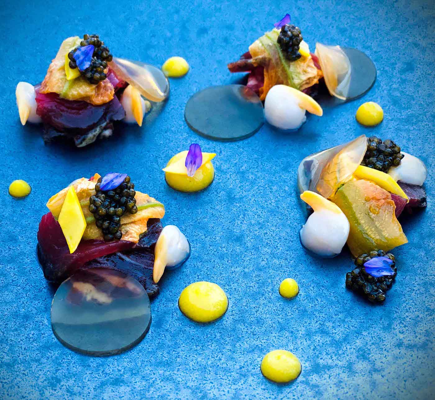 Dans sa cuisine, au rythme des saisons, les saveurs iodées du terroir méditerranéen sont privilégiées grâce à des liens forts avec des artisans et producteurs locaux. Il œuvre main dans la main avec une association de vingt et un paysans aux alentours. Son plat de sériole [Sériole de nos côtes grillées, rhubarbe vivifiante, jus d’arêtes doré aux fèves du Pays] en est une illustration audacieuse : un poisson de grand fonds peu connu des restaurants étoilés, péché au large de Beaulieu et Menton.