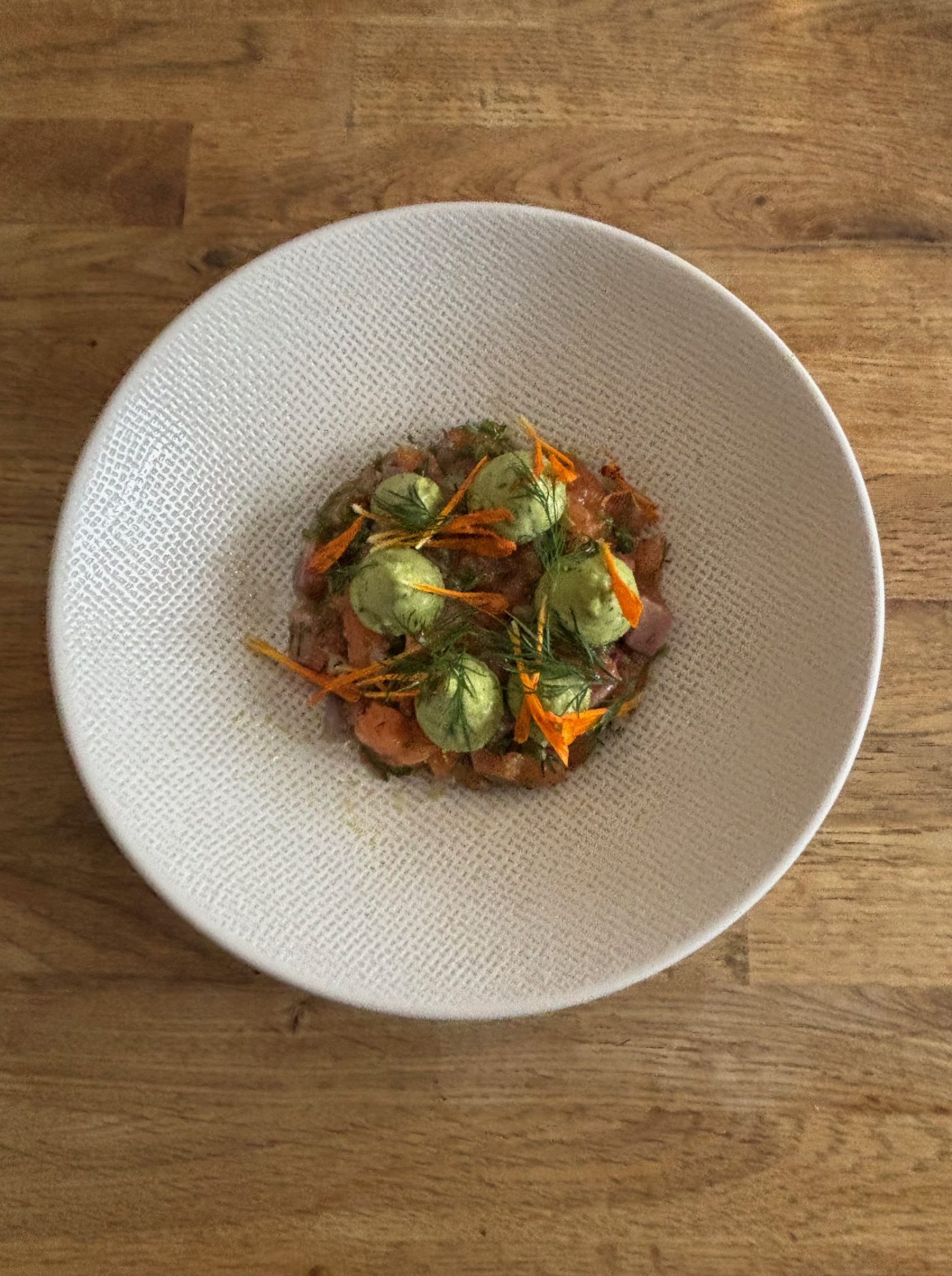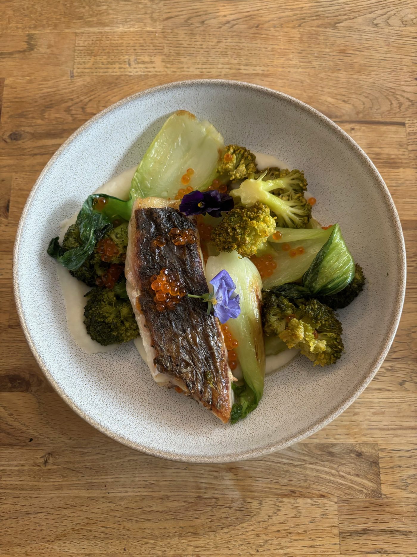 Les formules évoluant ici, au gré des saisons et des arrivages quotidiens, on passe à l’attaque avec l’étape alléchante dite des « Petites Assiettes ». Un ravissant Tarama maison nous caresse le palais de son huile verte et de ses œufs Avruga. Avec cela, on nous recommande les tendres choux de Bruxelles à la crème citronnée. Un coup de fourchette fondé sur la simplicité et le goût. Sur notre lancée, on demande à voir le célèbre tartare de truite et guacamole qui fait des ravages. Ce plat sera l’occasion de se faire une idée sur la composition et la fraîcheur des ingrédients retenus par le chef. La belle vinaigrette aux agrumes et le combava éveillent très agréablement les papilles. Coté soif et pour un accord mets&vins pertinent, on fait l’expérience d’un vin à la verse des Cotes Catalanes faisant converser Carignan Blanc, Maccabeu, Riberach et Grenache.