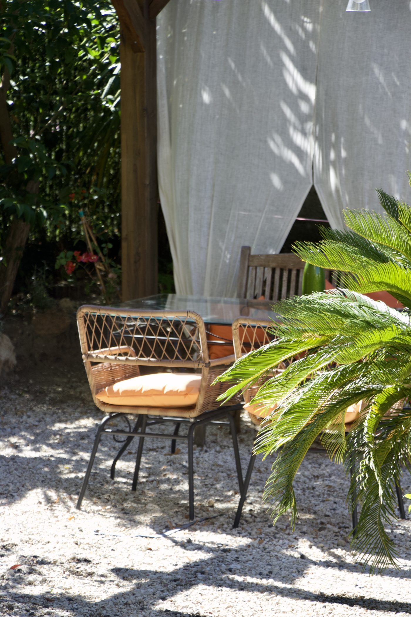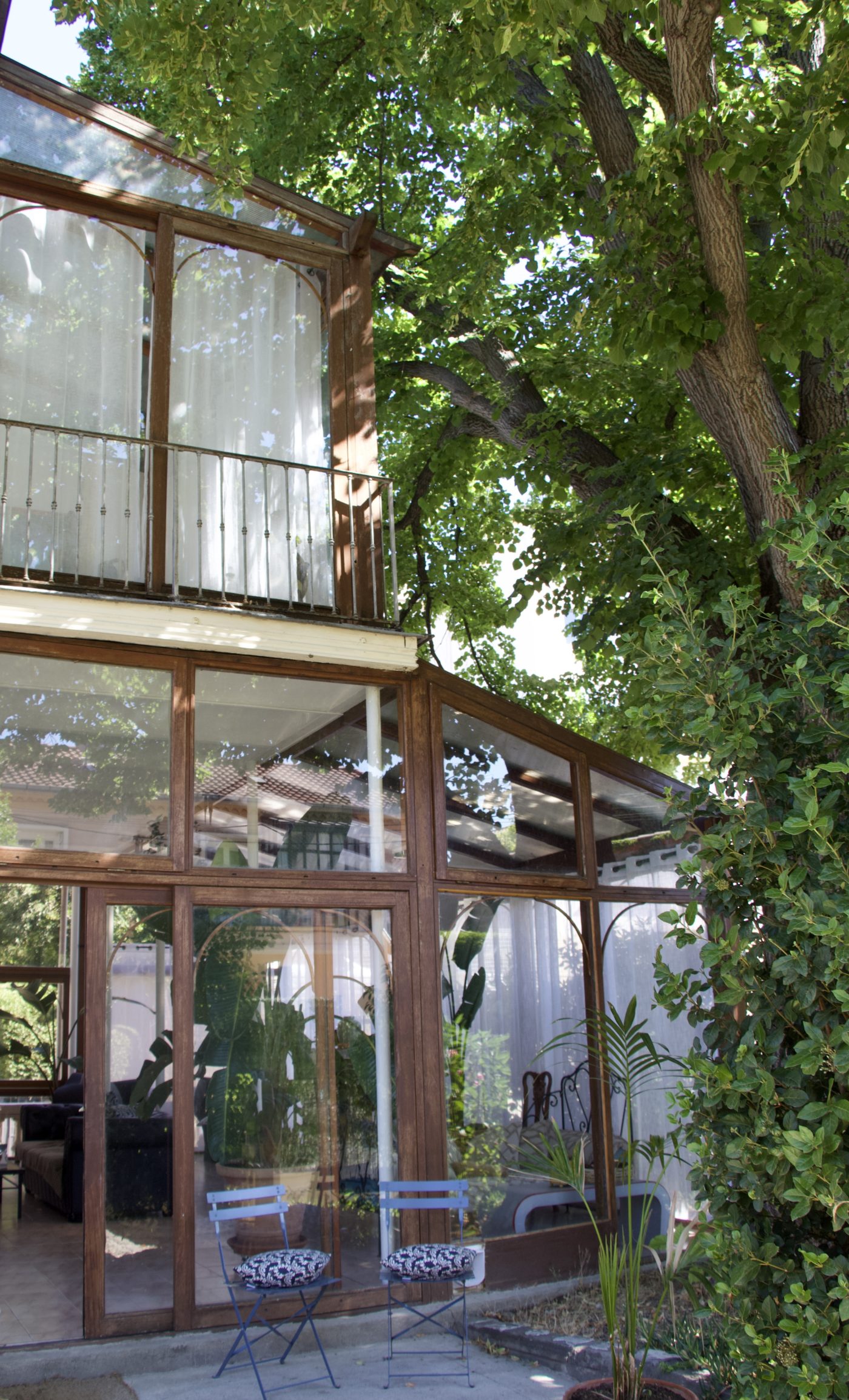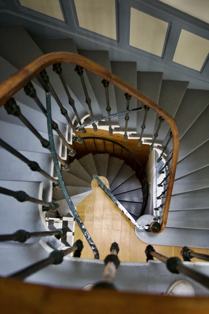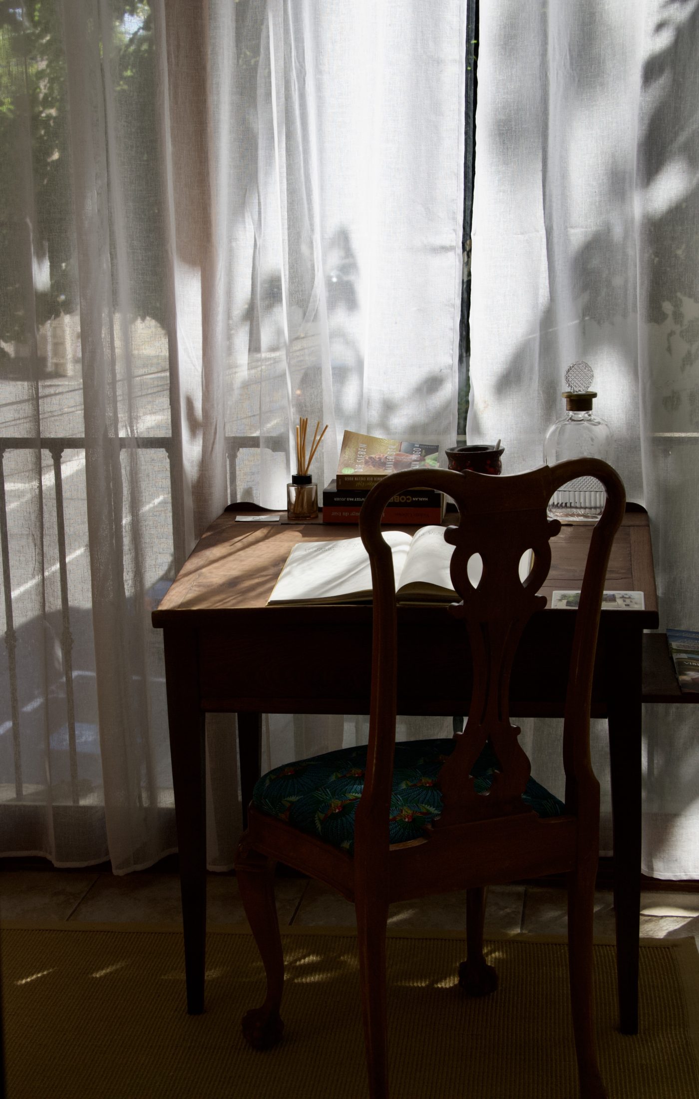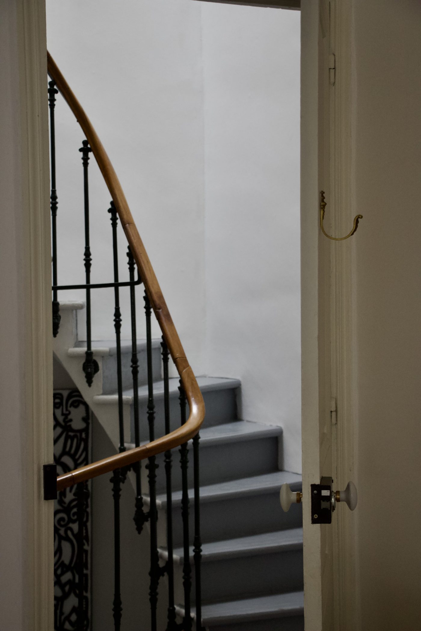 Un escalier d’époque, quintessence de l’esthétisme et pilier de la maison, sépare les trois chambres dont l’une se situe au rez-de-chaussée et les deux autres au premier étage, disposant de leur propre balconnet surplombant le lyrisme du jardin ou le flot de la vie urbaine, derrière de fins rideaux. L’un abrite un joli secrétaire propice à l’inspiration, traversé par un soleil pourtant retenu par un subtil voile de lin. Dans la pièce voisine, une table ronde d’antiquaire sur laquelle repose livres, jeux de cartes et de dominos anciens, remplace le bureau d’à-côté dans un charme similaire.
