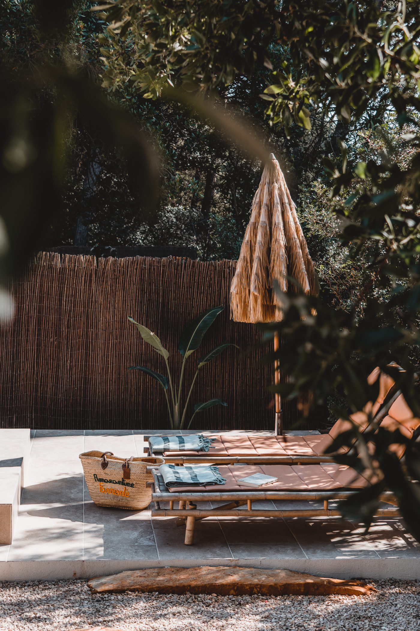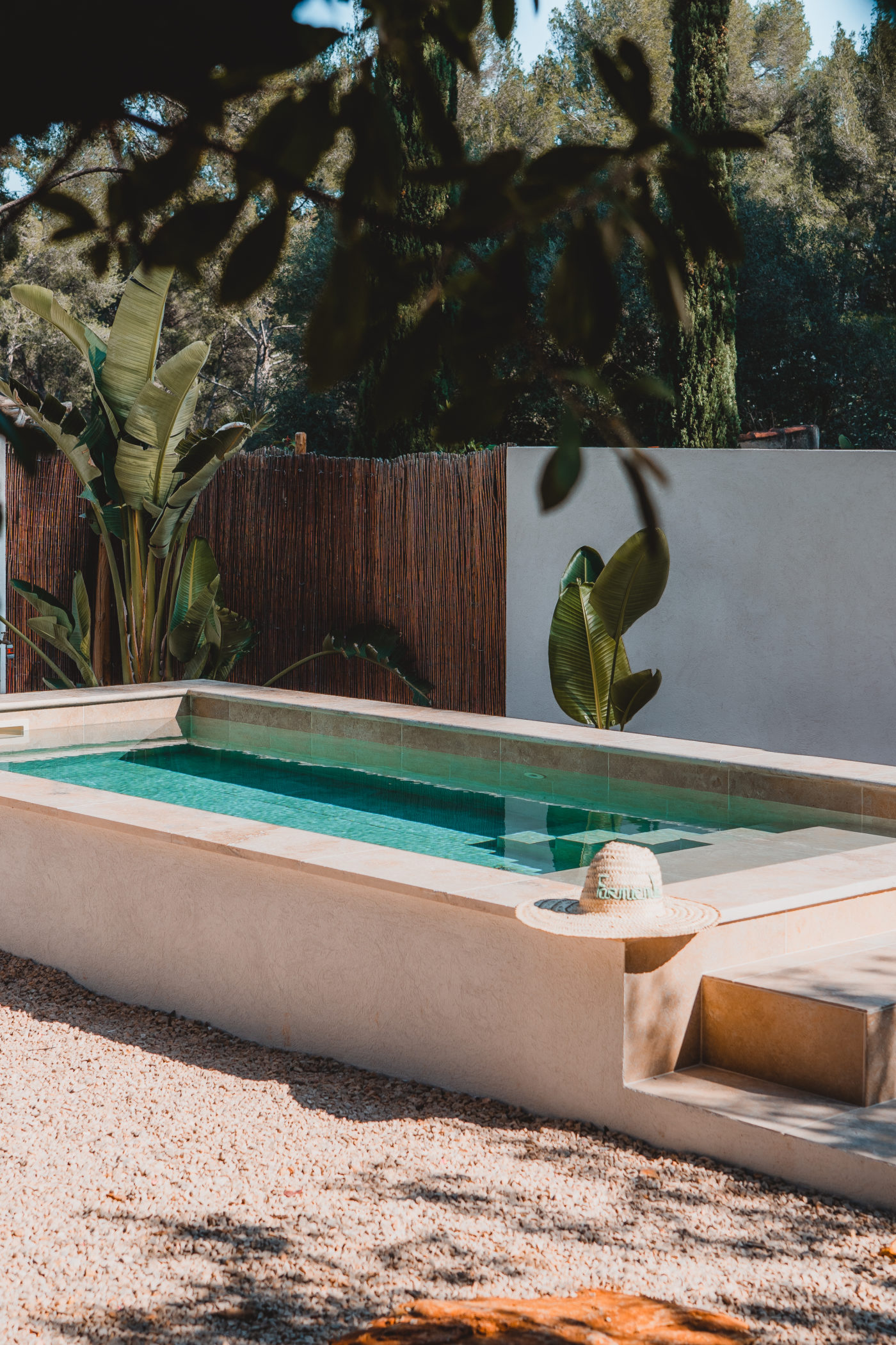 D’abord, il nous faut emprunter une route lisse bordée de pins aux accents du sud, puis un chemin de terre et des sentiers escarpés pour qu’enfin s’ouvre un grand portail et son havre de paix divisé en trois jardins sacrés, abritant bungalow de luxe, piscine individuelle et autres secrets bien gardés. Dans ce havre de paix, la tramontane enveloppe nos sens d’effluves de romarin et de volutes d’épines de pins, éloignant au passage la rumeur de la ville. Il y règne un silence religieux orchestré par le seul fredonnement des cigales et le chœur des oiseaux. La brise du sud transporte ses volutes tièdes d’air iodé et étouffe les heures, son soleil réchauffe nos cœurs allégés de contraintes et de tourments.