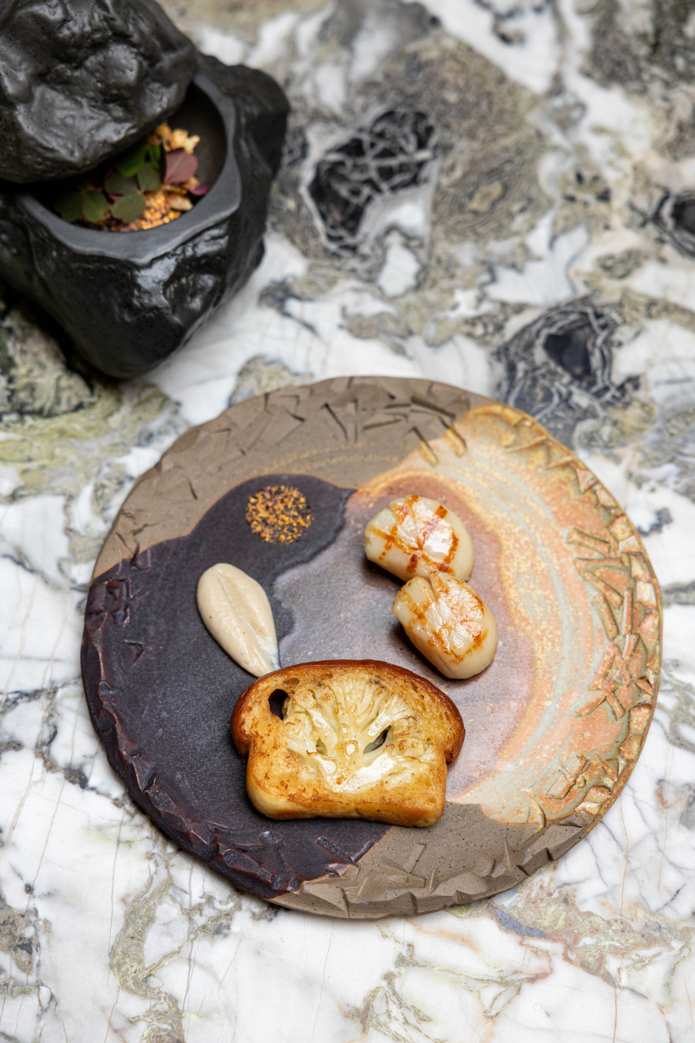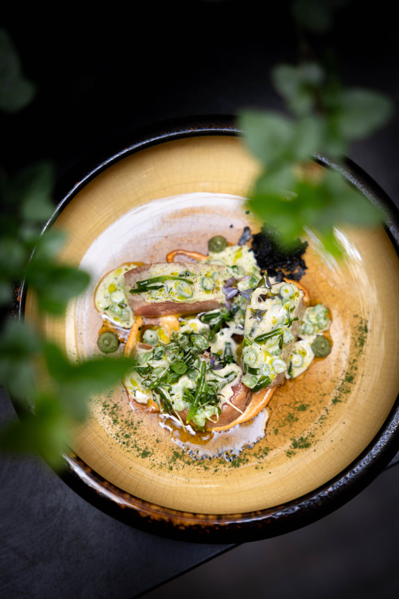 Ses entrées délicates et ses plats francs font appel à des ingrédients du quotidien rappelant l’engagement d’un anti-gaspillage acceptant la remise en question. On part à la découverte de cette cuisine inventive, mettant au diapason textures et saveurs, avec au préalable deux entrées croisées : « Le végétal marin » faisant chanter salicorne et fleurs, bonite fumée et oursin. L’émotion en bouche se fait immédiate. En écho, le deuxième entrée de « La ferme », jouant subtilement de son vin chaud, foie gras et tamarin, nous dit que le chef compose ses menus au gré du marché et qu’il n’oublie jamais ni le goût ni la générosité. L’étape suivante des plats nous conduit immanquablement vers la surprenante « La plongée » orchestrée avec son étonnant chou-fleur brioché, sa Saint Jacques et curry. La qualité des produits, magnifiés sans être dénaturés, se charge de susciter ce sentiment sincère de volupté en bouche.