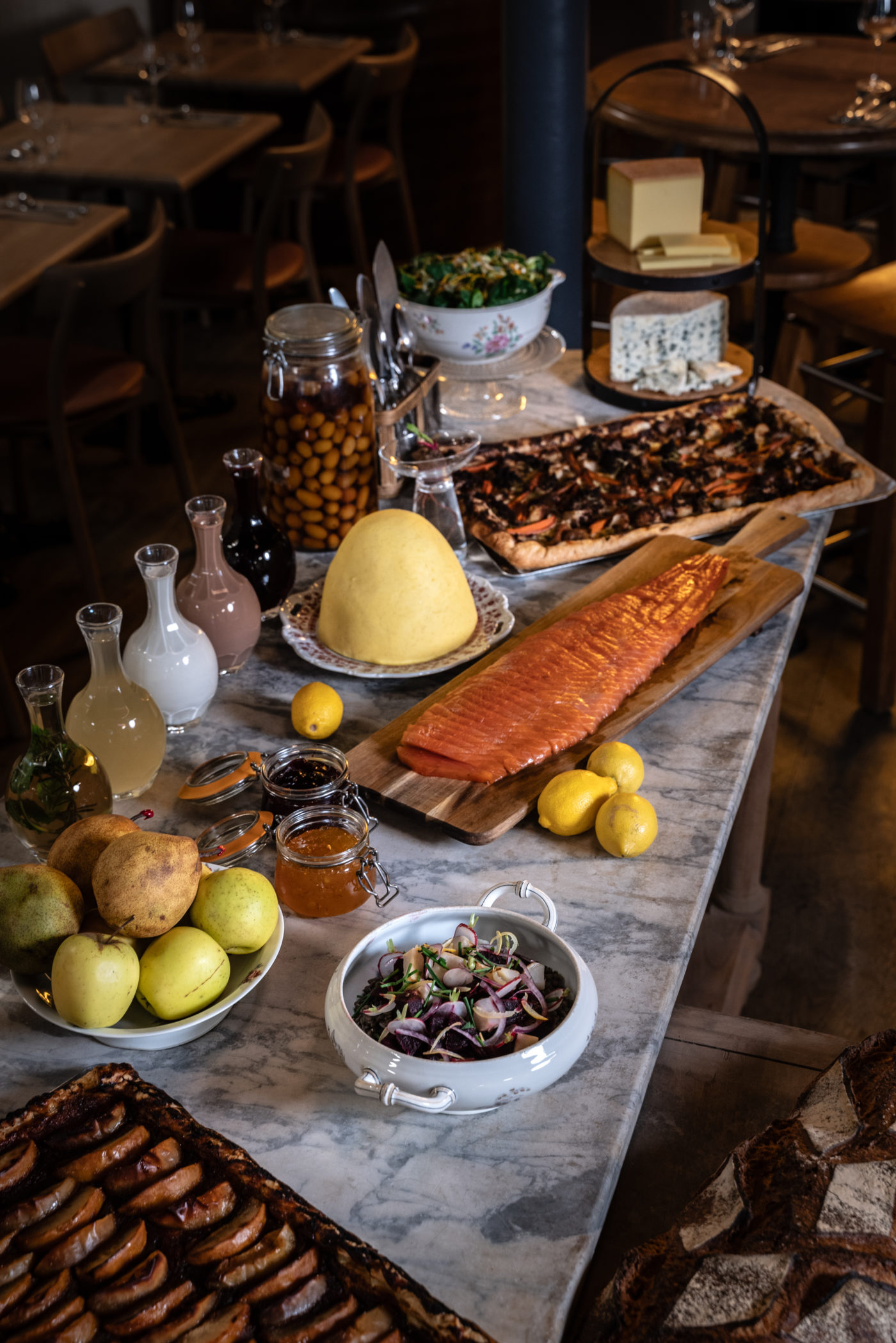 Le tout s’accompagne des merveilleuses créations fait-maison du « banquet », où l’on trouve : tarte aux légumes du jardin, saumon fumé de Bretagne, meule de fromage à pâte dure, motte de beurre aux cristaux de sel, miche de pain de campagne, salade de lentilles aux épices orientales, tarte aux abricots, brioche, confitures maison de poire et d’oranges amères, muesli maison, fromage blanc, fruits frais de saison et boissons artisanales de toute sorte : kéfir, jus d’herbes, jus de sureau…