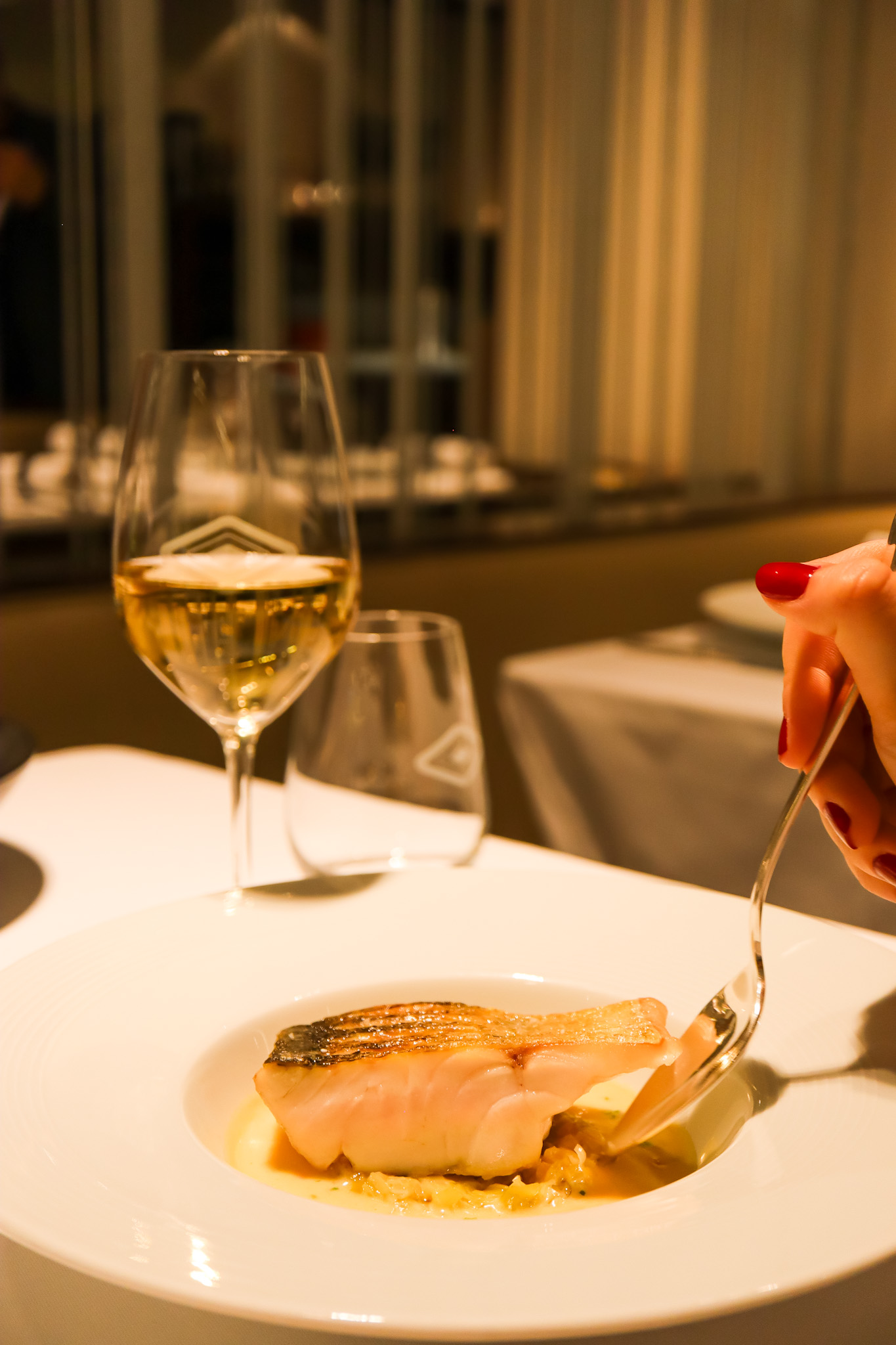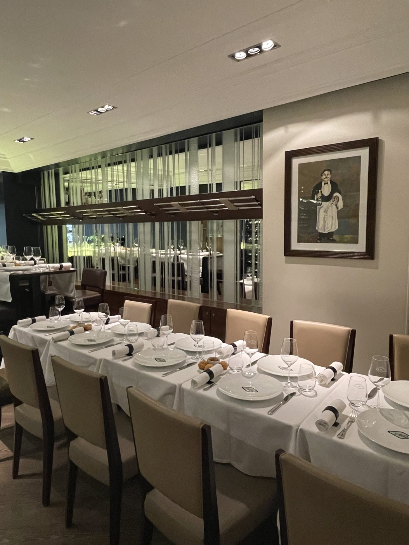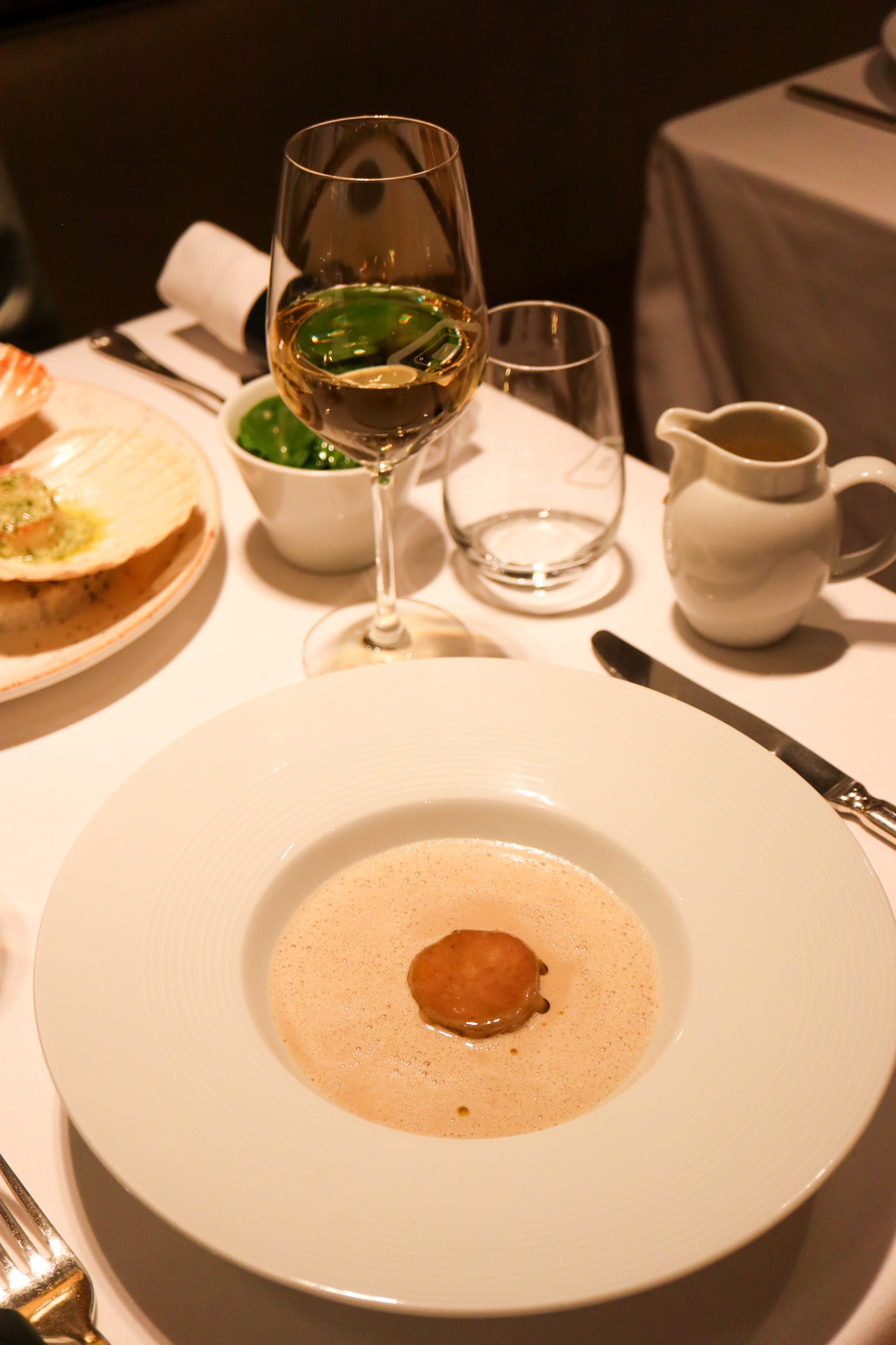 On entre dans cet élégant décor bleuté parcouru de miroirs, où nous attend la nouvelle directrice Giuliana Bersani. L’accueil chaleureux est divin. On attaque donc notre dégustation dans un climat aussi serein qu’enthousiaste avec de gracieuses noix de coquilles Saint-Jacques rôties au beurre d’escargot accompagnées d’une salade de jeunes pousses d’épinards. On est conquis par la fraîcheur du produit et l’assaisonnement harmonieux tout en subtilité. Arrive ensuite, le plat-star de la raviole de foie gras aux champignons des bois et bouillon mousseux de châtaignes qui caresse amoureusement le palais et séduit aussitôt, comme jamais, les papilles.